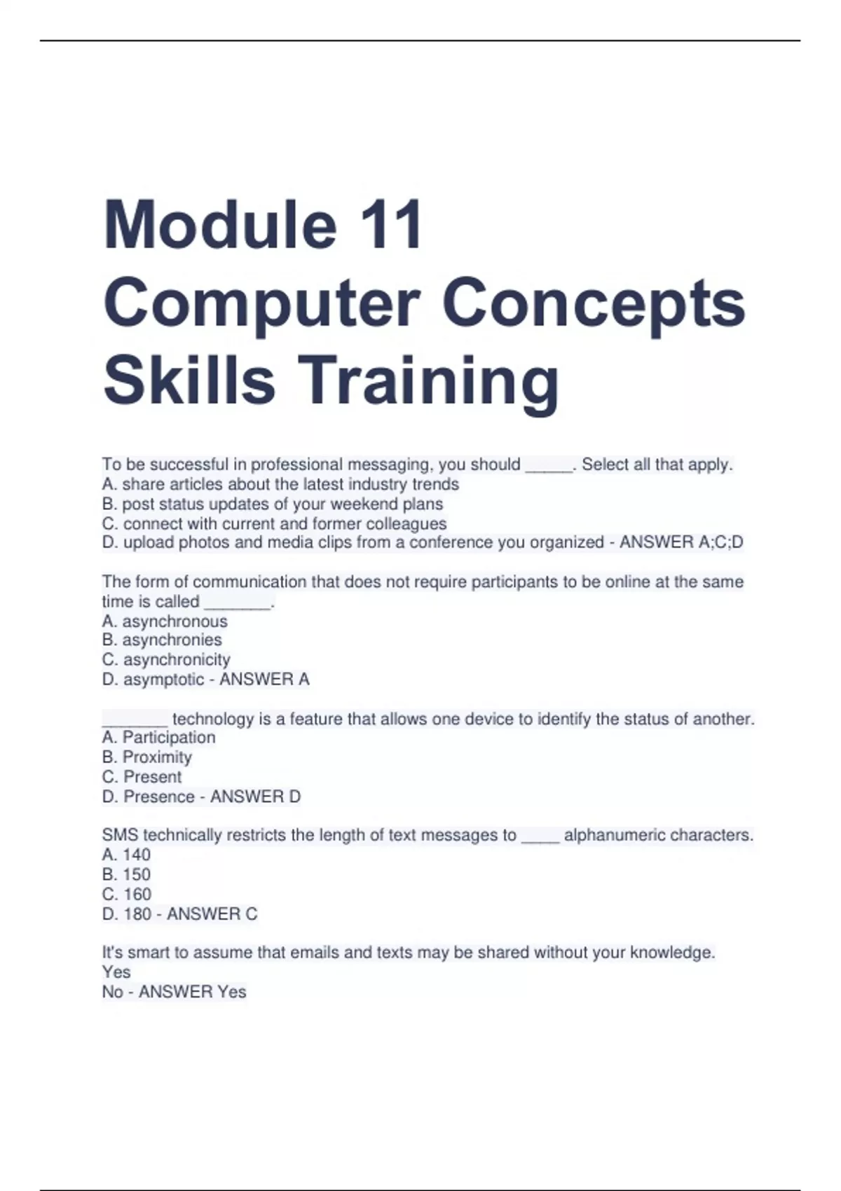 Module 11 Computer Concepts Skills Training To be successful in professional messaging, you should _____. Select all that apply. A. share articles about the latest industry trends B. post status updates of your weekend plans C. connect with current and former colleagues D. upload photos and media clips from a conference you organized - ANSWER A;C;D The form of communication that does not require participants to be online at the same time is called _______. A. asynchronous B. asynchronies C. asynchronicity D. asymptotic - ANSWER A _______ technology is a feature that allows one device to identify the status of another. A. Participation B. Proximity C. Present D. Presence - ANSWER D SMS technically restricts the length of text messages to ____ alphanumeric characters. A. 140 B. 150 C. 160 D. 180 - ANSWER C It's smart to assume that emails and texts may be shared without your knowledge. Yes No - ANSWER Yes All recipients are able to see the Bcc line of an email message. Yes No - ANSWER No Digital communication methods transfer data in _____________ format. A. analog B. binary C. email D. synchronous - ANSWER B Teleconferencing enables hundreds of participants to read and respond to posts over a period of months or years. Yes No - ANSWER No What type of social media site is best suited for posting a how-to video series? A. media sharing B. file sharing C. blogging D. virtual social worlds - ANSWER A Describe how geotagging is used in social networking. A. It assesses the quality of a connection to a network server. B. It assigns a location to a posted image or video. C. It allows a user to enter certain sections of a social network. D. It analyzes usage statistics based on login locations. - ANSWER B Most social networks serve only one purpose or one type of user. Yes No - ANSWER No The goal of crowdsourcing is to gain support only from those in your immediate social circle. True False - ANSWER False To exchange messages on a social network, you must use a dedicated texting app. Yes No - ANSWER No Common blog software features include _____. Select all that apply. A. the ability to add photos B. labeling or tagging of posts C. social media sharing tools D. theme or template chooser - ANSWER All of them If you review products on your blog, you shouldn't tell readers if you're being compensated by the manufacturer. Yes No - ANSWER No Which of the following protocols syncs messages across multiple devices? A. SMTP B. POP C. IMAP D. HTTP - ANSWER C Once you have added a friend or follower on a personal social network, you shouldn't remove them. Yes No - ANSWER No