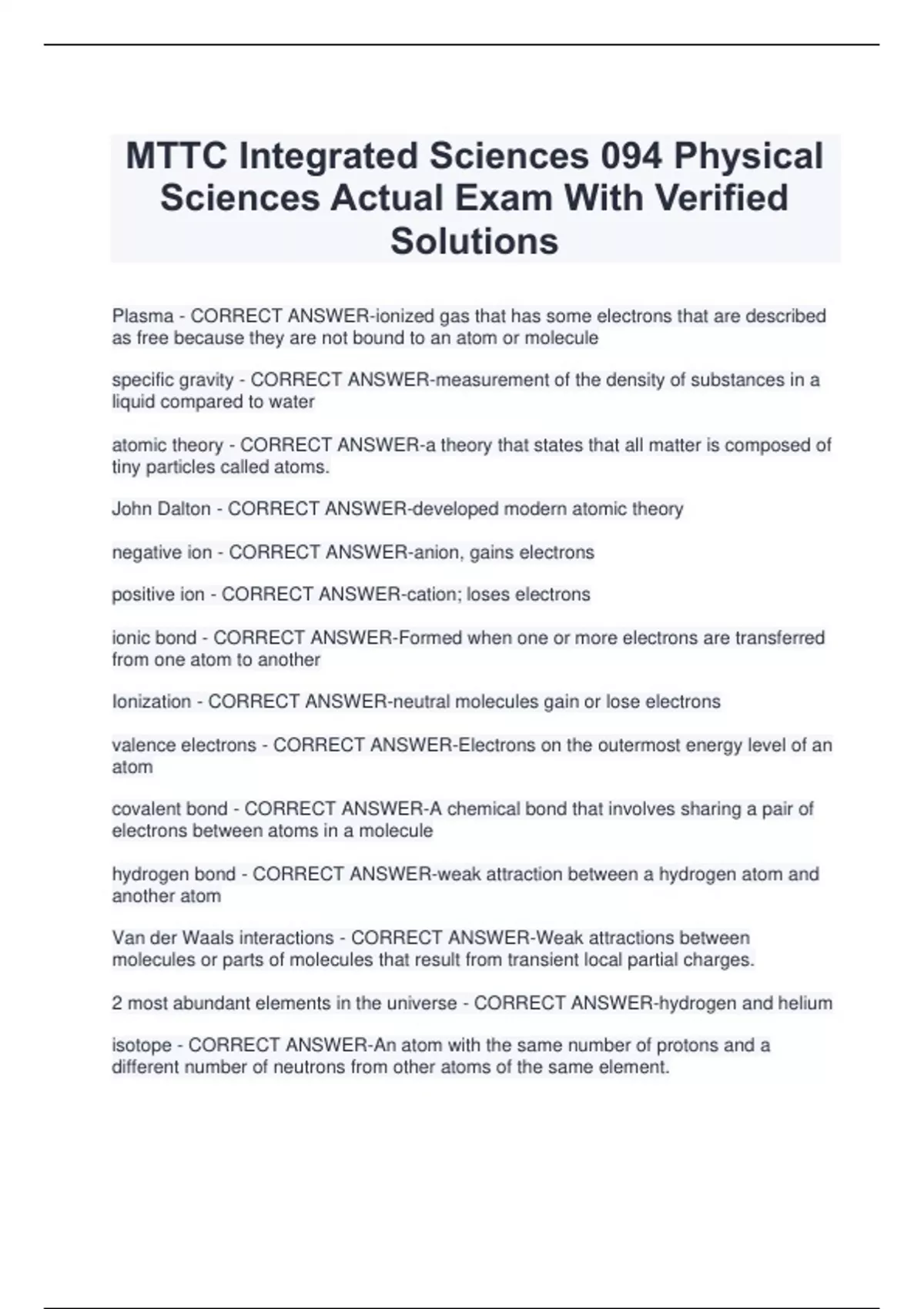 MTTC Integrated Sciences 094 Physical Sciences Actual Exam With Verified Solutions Plasma - CORRECT ANSWER-ionized gas that has some electrons that are described as free because they are not bound to an atom or molecule specific gravity - CORRECT ANSWER-measurement of the density of substances in a liquid compared to water atomic theory - CORRECT ANSWER-a theory that states that all matter is composed of tiny particles called atoms. John Dalton - CORRECT ANSWER-developed modern atomic theory negative ion - CORRECT ANSWER-anion, gains electrons positive ion - CORRECT ANSWER-cation; loses electrons ionic bond - CORRECT ANSWER-Formed when one or more electrons are transferred from one atom to another Ionization - CORRECT ANSWER-neutral molecules gain or lose electrons valence electrons - CORRECT ANSWER-Electrons on the outermost energy level of an atom covalent bond - CORRECT ANSWER-A chemical bond that involves sharing a pair of electrons between atoms in a molecule hydrogen bond - CORRECT ANSWER-weak attraction between a hydrogen atom and another atom Van der Waals interactions - CORRECT ANSWER-Weak attractions between molecules or parts of molecules that result from transient local partial charges. 2 most abundant elements in the universe - CORRECT ANSWER-hydrogen and helium isotope - CORRECT ANSWER-An atom with the same number of protons and a different number of neutrons from other atoms of the same element