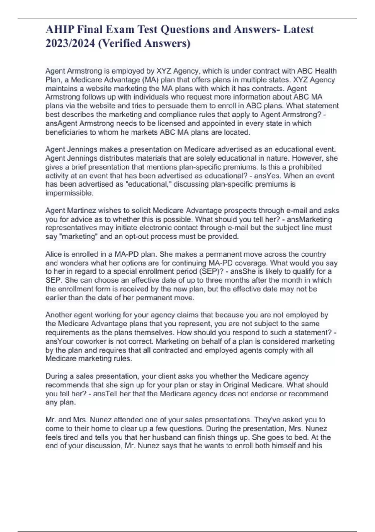 AHIP Final Exam Test Questions and Answers- Latest 2023/2024 (Verified Answers)