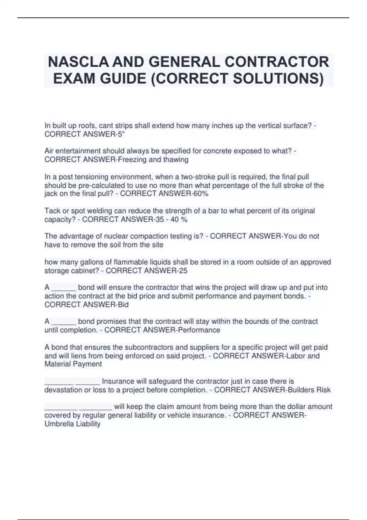 NASCLA AND GENERAL CONTRACTOR EXAM GUIDE (CORRECT SOLUTIONS) In built up roofs, cant strips shall extend how many inches up the vertical surface? - CORRECT ANSWER-5" Air entertainment should always be specified for concrete exposed to what? - CORRECT ANSWER-Freezing and thawing In a post tensioning environment, when a two-stroke pull is required, the final pull should be pre-calculated to use no more than what percentage of the full stroke of the jack on the final pull? - CORRECT ANSWER-60% Tack or spot welding can reduce the strength of a bar to what percent of its original capacity? - CORRECT ANSWER-35 - 40 % The advantage of nuclear compaction testing is? - CORRECT ANSWER-You do not have to remove the soil from the site how many gallons of flammable liquids shall be stored in a room outside of an approved storage cabinet? - CORRECT ANSWER-25 A ______ bond will ensure the contractor that wins the project will draw up and put into action the contract at the bid price and submit performance and payment bonds. - CORRECT ANSWER-Bid A ______ bond promises that the contract will stay within the bounds of the contract until completion. - CORRECT ANSWER-Performance A bond that ensures the subcontractors and suppliers for a specific project will get paid and will liens from being enforced on said project. - CORRECT ANSWER-Labor and Material Payment _______ ______ Insurance will safeguard the contractor just in case there is devastation or loss to a project before completion. - CORRECT ANSWER-Builders Risk ________ ________ will keep the claim amount from being more than the dollar amount covered by regular general liability or vehicle insurance. - CORRECT ANSWERUmbrella Liabilit