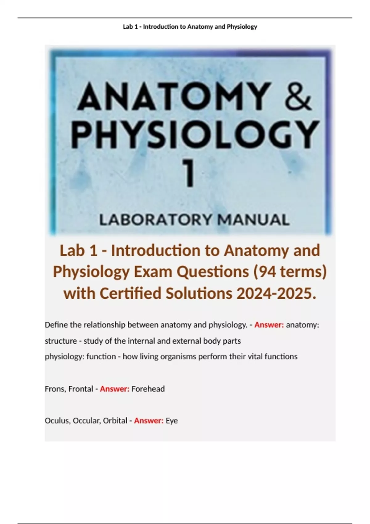 Lab 1 - Introduction to Anatomy and Physiology Exam Questions (94 terms) with Certified Solutions .