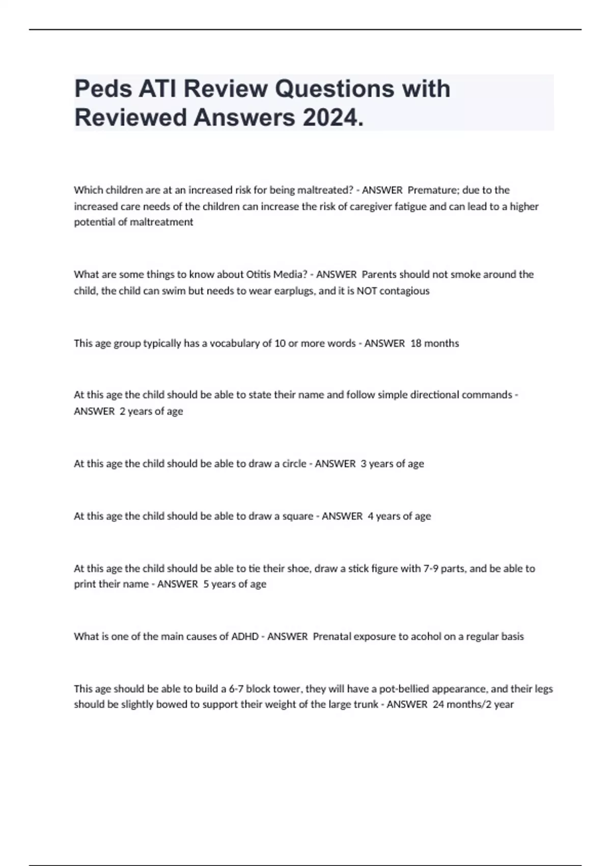 Peds ATI Review Questions with Reviewed Answers 2024. Which children are at an increased risk for being maltreated? Premature; due to the increased care needs of the children can increase the risk of caregiver fatigue and can lead to a higher potential of maltreatment What are some things to know about Otitis Media? Parents should not smoke around the child, the child can swim but needs to wear earplugs, and it is NOT contagious This age group typically has a vocabulary of 10 or more words 18 months At this age the child should be able to state their name and follow simple directional commands 2 years of age