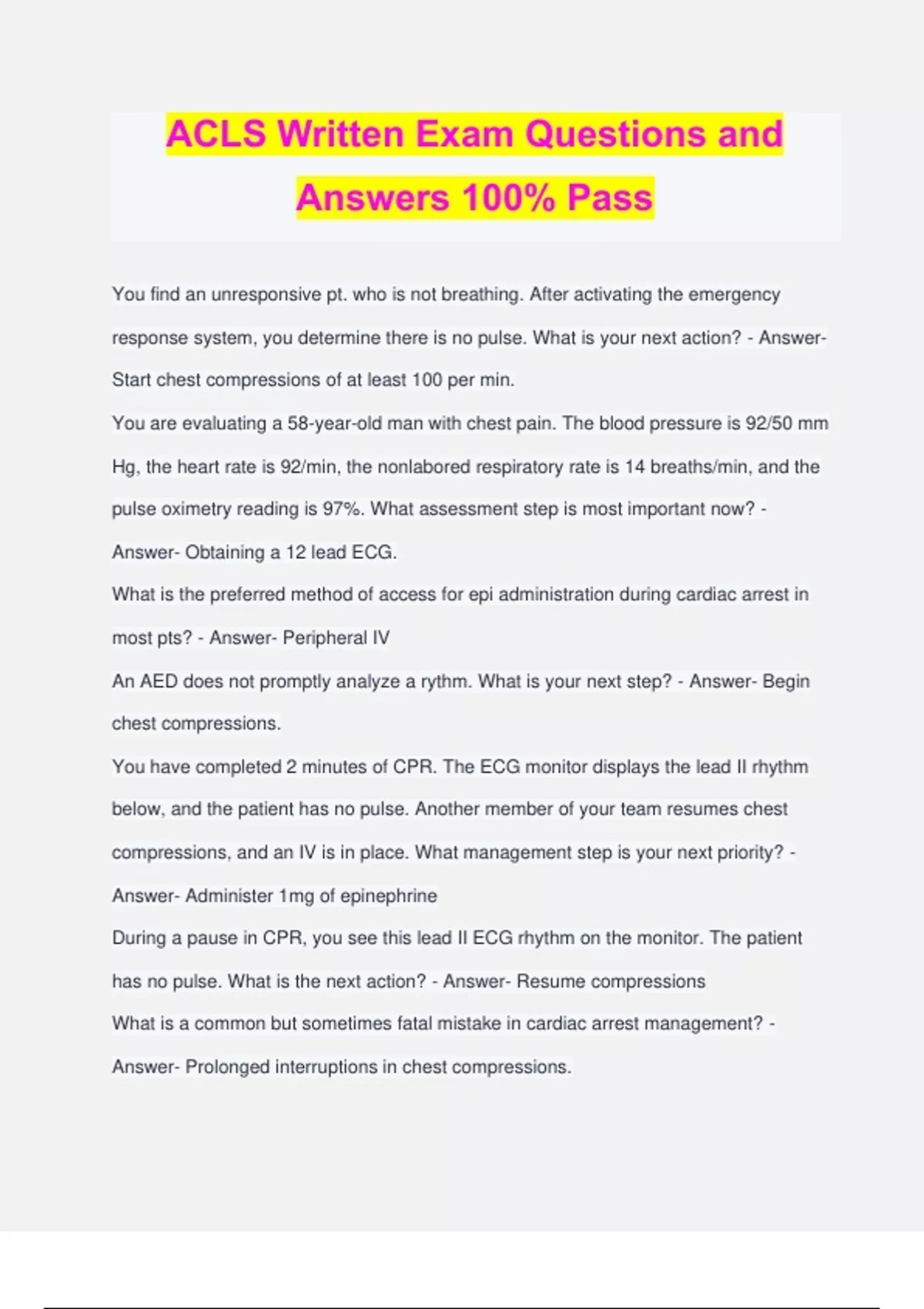 ACLS Written Exam Questions and Answers 100% Pass You find an unresponsive pt. who is not breathing. After activating the emergency response system, you determine there is no pulse. What is your next action? - Answer- Start chest compressions of at least 100 per min. You are evaluating a 58-year-old man with chest pain. The blood pressure is 92/50 mm Hg, the heart rate is 92/min, the nonlabored respiratory rate is 14 breaths/min, and the pulse oximetry reading is 97%. What assessment step is most important now? - Answer- Obtaining a 12 lead ECG. What is the preferred method of access for epi administration during cardiac arrest in most pts? - Answer- Peripheral IV An AED does not promptly analyze a rythm. What is your next step? - Answer- Begin chest compressions. You have completed 2 minutes of CPR. The ECG monitor displays the lead II rhythm below, and the patient has no pulse. Another member of your team resumes chest compressions, and an IV is in place. What management step is your next priority? - Answer- Administer 1mg of epinephrine During a pause in CPR, you see this lead II ECG rhythm on the monitor. The patient has no pulse. What is the next action? - Answer- Resume compressions What is a common but sometimes fatal mistake in cardiac arrest management? - Answer- Prolonged interruptions in chest compressions. Which action is a componant of high-quality chest comressions? - Answer- Allowing complete chest recoil Which action increases the chance of successful conversion of ventricular fibrillation? - Answer- Providing quality compressions immediately before a defibrillation attempt. Which situation BEST describes pulseless electrical activity? - Answer- Sinus rythm without a pulse What is the BEST strategy for performing high-quality CPR on a patient with an advanced airway in place? - Answer- Provide continuous chest compressions without pauses and 10 ventilations per minute. Three minutes after witnessing a cardiac arrest, one member of your team inserts an endotracheal tube while another performs continuous chest compressions. During subsequent ventilation, you notice the presence of a waveform on the capnography screen and a PETCO2 level of 8 mm Hg. What is the significance of this finding? - Answer- Chest compressions may not be effective. The use of quantitative capnography in intubated patients - Answer- allows for monitoring of CPR quality. For the past 25 minutes, an EMS crew has attempted resuscitation of a patient who originally presented in ventricular fibrillation. After the first shock, the ECG screen displayed asystole, which has persisted despite 2 doses of epinephrine, a fluid bolus, and high-quality CPR. What is your next treatment? - Answer- Consider terminating resuscitive efforts after consulting medical control. Which is a safe and effective practice within the defibrillation sequence? - Answer- Be sure oxygen is not blowing over the patient's chest during the shock. During your assessment, your patient suddenly loses consciousness. After calling for help and determining that the patient is not breathing, you are unsure whether the patient has a pulse. What is your next action? - Answer- Begin chest compressions. What is an advantage of using hands-free defibrillation pads instead of defibrillation paddles? - Answer- Hands-free pads allow for a more rapid defibrillation. What action is recommended to help minimize interruptions in chest compressions during CPR? - Answer- Continue CPR while charging the defibrillator. Which action is included in the BLS survey? - Answer- Early defibrillation Which drug and dose are recommended for the management of a patient in refractory ventricular fibrillation? - Answer- Amioderone 300mg What is the appropriate interval for an interruption in c