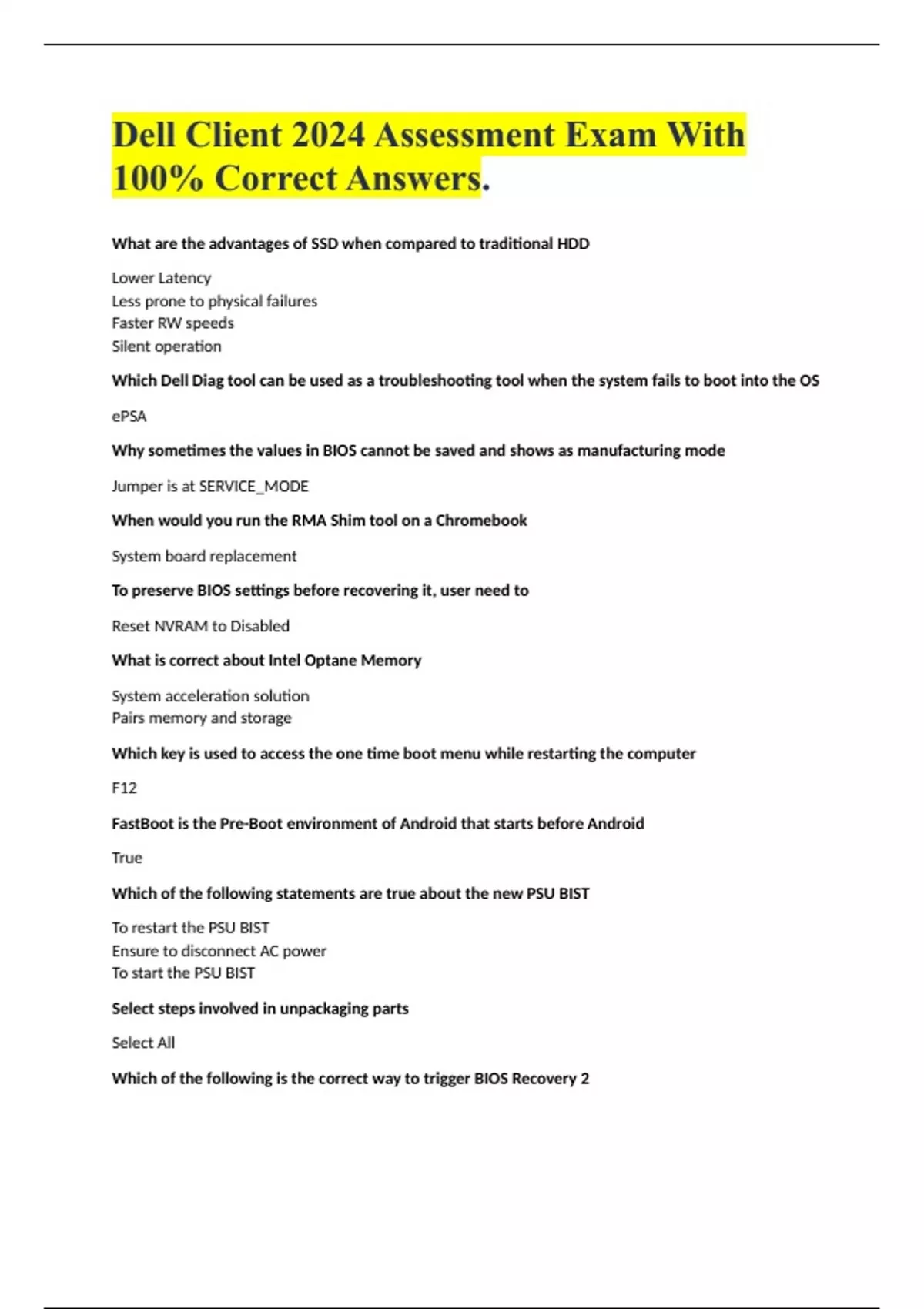 Dell Client 2024 Assessment Exam With 100% Correct Answers. What are the advantages of SSD when compared to traditional HDD Lower Latency Less prone to physical failures Faster RW speeds Silent operation Which Dell Diag tool can be used as a troubleshooting tool when the system fails to boot into the OS ePSA Why sometimes the values in BIOS cannot be saved and shows as manufacturing mode Jumper is at SERVICE_MODE When would you run the RMA Shim tool on a Chromebook System board replacement To preserve BIOS settings before recovering it, user need to Reset NVRAM to Disabled