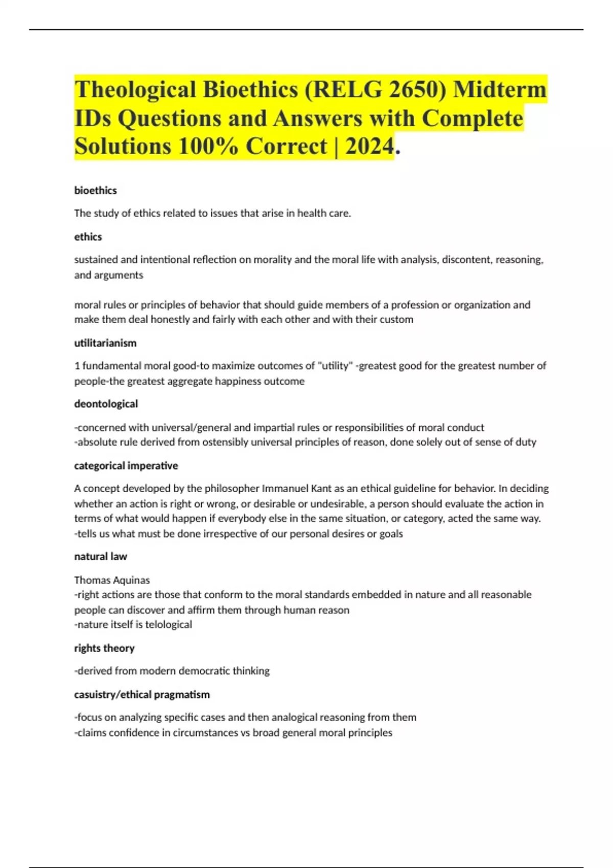 Theological Bioethics (RELG 2650) Midterm IDs Questions and Answers with Complete Solutions 100% Correct | 2024.