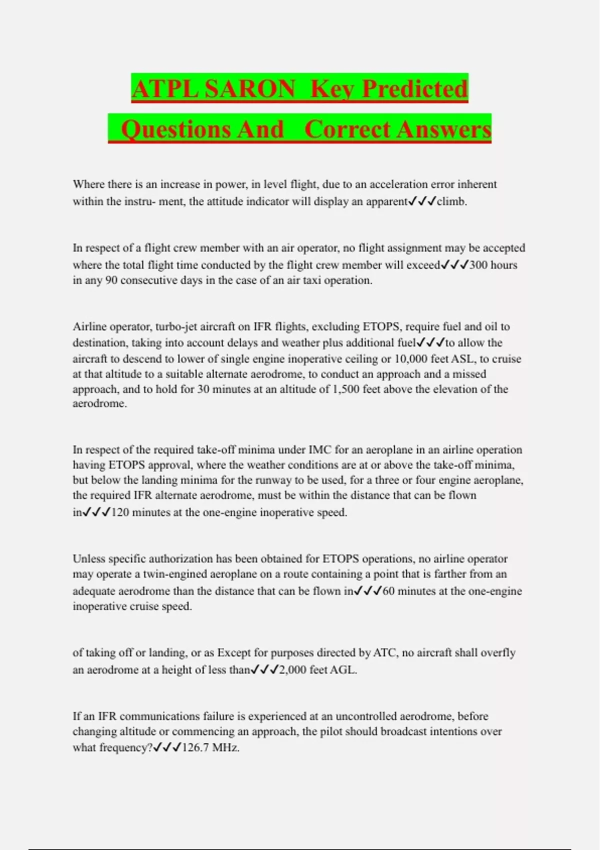 ATPL SARON Key Predicted Questions And Correct Answers