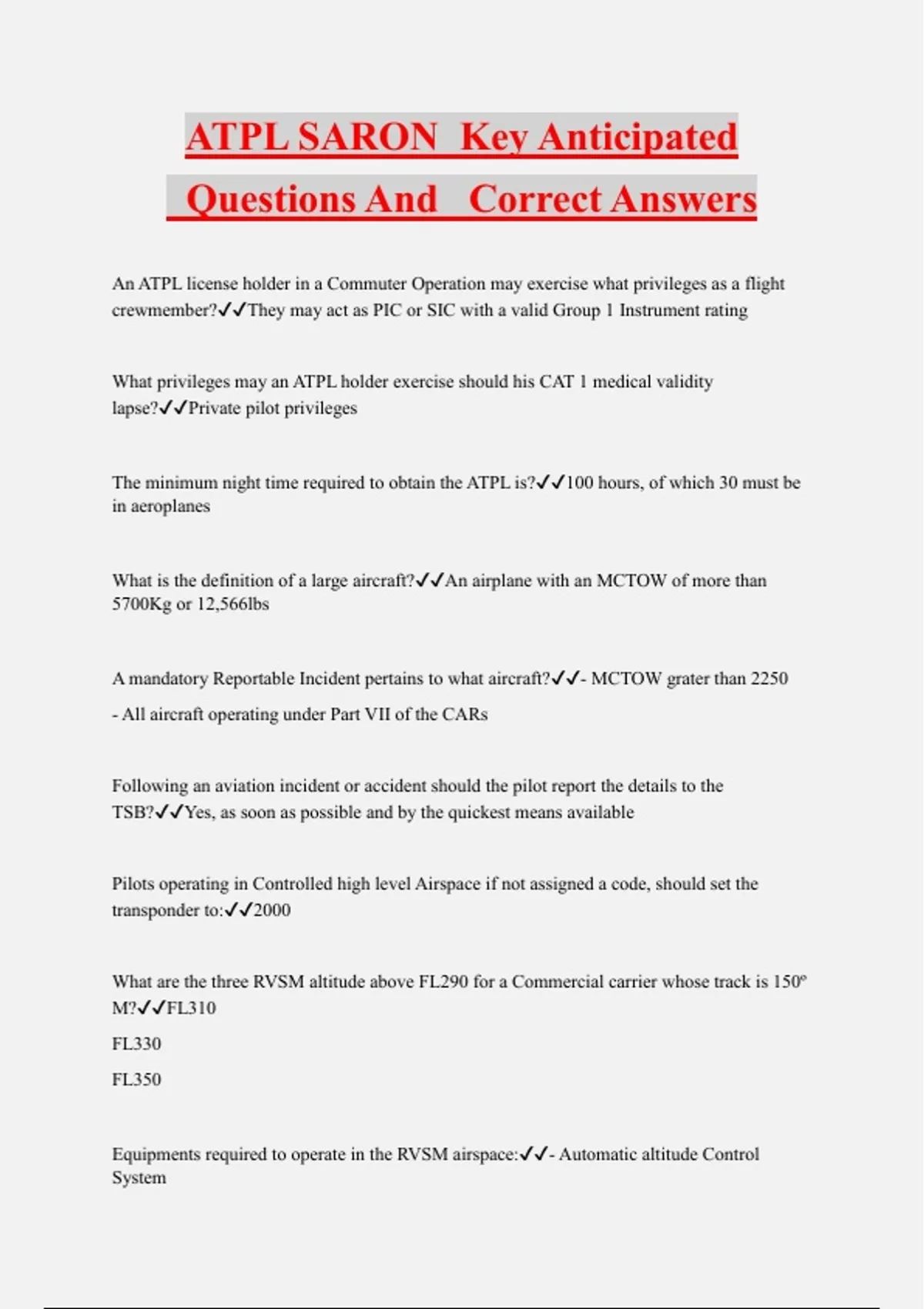 ATPL SARON Key Anticipated Questions And Correct Answers