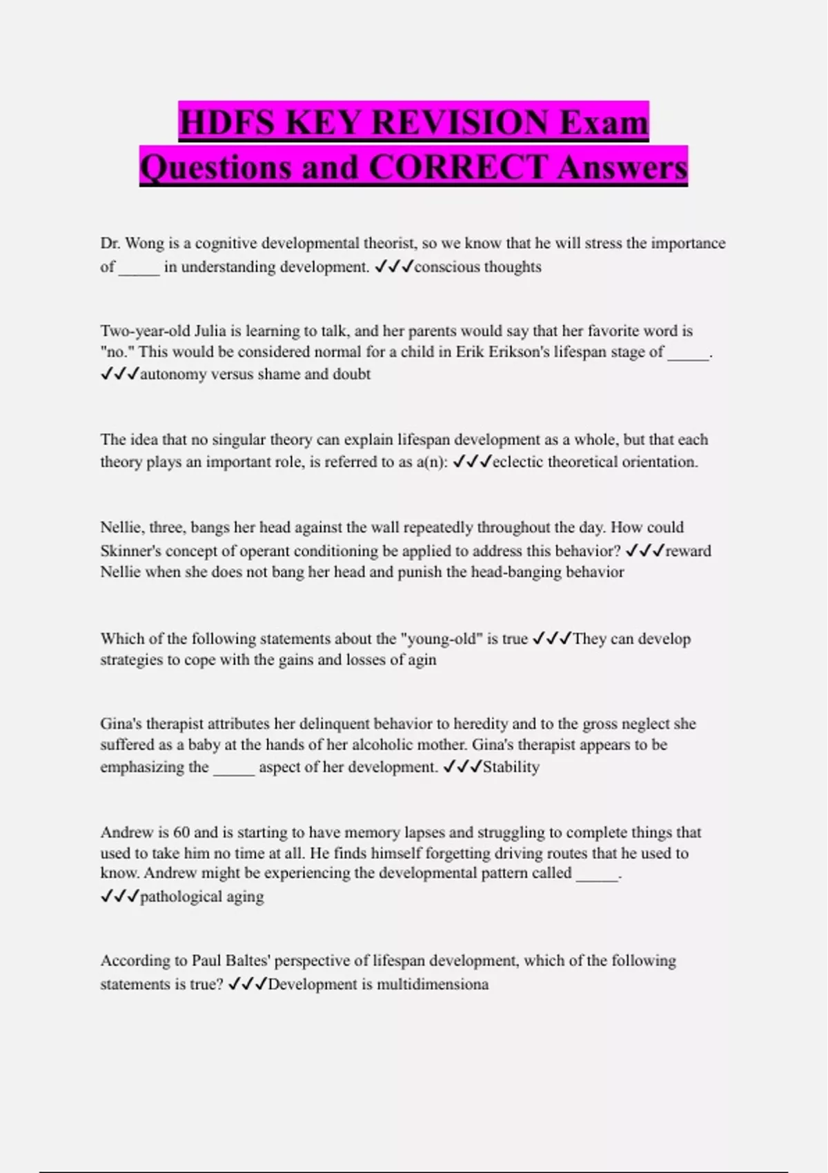 Dr. Wong is a cognitive developmental theorist, so we know that he will stress the importance of _____ in understanding development. conscious thoughts Two-year-old Julia is learning to talk, and her parents would say that her favorite word is "no." This would be considered normal for a child in Erik Erikson's lifespan stage of _____. autonomy versus shame and doubt The idea that no singular theory can explain lifespan development as a whole, but that each theory plays an important role, is referred to as a(n): eclectic theoretical orientation.