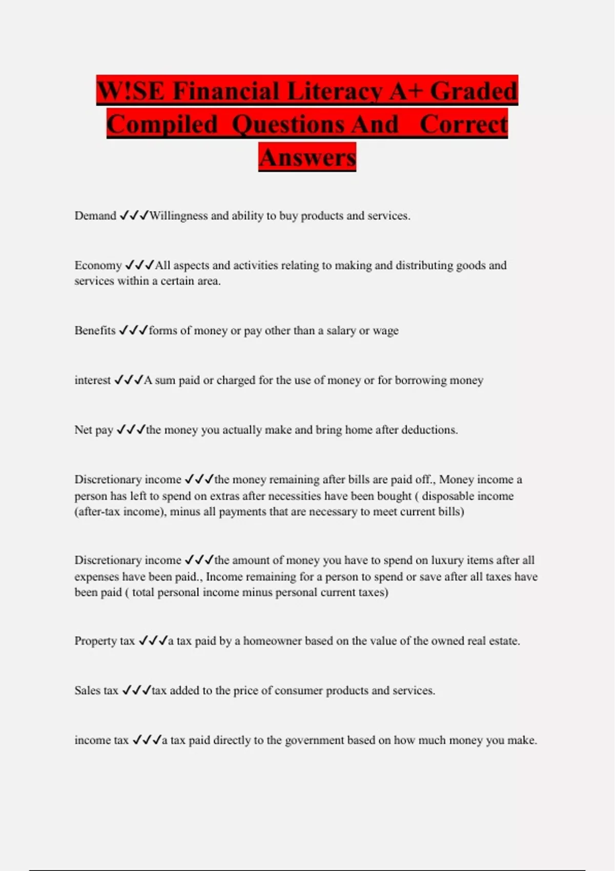 W!SE Financial Literacy A+ Graded Compiled Questions And Correct Answers