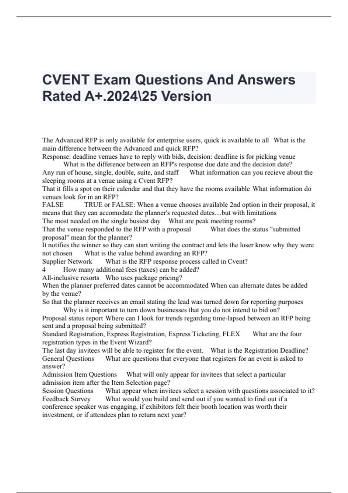 CVENT Exam Questions And Answers Rated A+.202425 Version The Advanced RFP is only available for enterprise users, quick is available to all What is the main difference between the Advanced and quick RFP? Response: deadline venues have to reply with bids, decision: deadline is for picking venue What is the difference between an RFP's response due date and the decision date? Any run of house, single, double, suite, and staff What information can you recieve about the sleeping rooms at a venue using a Cvent RFP? That it fills a spot on their calendar and that they have the rooms available What information do venues look for in an RFP? FALSE TRUE or FALSE: When a venue chooses available 2nd option in their proposal, it means that they can accomodate the planner's requested dates....but with limitations The most needed on the single busiest day What are peak meeting rooms? That the venue responded to the RFP with a proposal What does the status "submitted proposal" mean for the planner? It notifies the winner so they can start writing the contract and lets the loser know why they were not chosen What is the value behind awarding an RFP? Supplier Network What is the RFP response process called in Cvent? 4 How many additional fees (taxes) can be added? All-inclusive resorts Who uses package pricing? When the planner preferred dates cannot be accommodated When can alternate dates be added by the venue? So that the planner receives an email stating the lead was turned down for reporting purposes Why is it important to turn down businesses that you do not intend to bid on? Proposal status report Where can I look for trends regarding time-lapsed between an RFP being sent and a proposal being submitted? Standard Registration, Express Registration, Express Ticketing, FLEX What are the four registration types in the Event Wizard? The last day invitees will be able to register for the event. What is the Registration Deadline? General Questions What are questions that everyone that registers for an event is asked to answer? Admission Item Questions What will only appear for invitees that select a particular admission item after the Item Selection page? Session Questions What appear when invitees select a session with questions associated to it? Feedback Survey What would you build and send out if you wanted to find out if a conference speaker was engaging, if exhibitors felt their booth location was worth their investment, or if attendees plan to return next year? Cvent Supplier Network (CSN) What is the name of the online database of more than 234,000 supplier listings, where planners can create RFPs, source venues, award bids, and communicate with suppliers? Shoulder Dates What are dates directly before or after the official event dates where sleeping rooms or meeting space may be available to book at the negotiated rate? Contact This is a record in your Address Book that represents an individual. This may include personal information, memberships, and activity tracking. Data Tag This allows you to quickly personalize mass communications. They look like letters and symbols in brackets, but when opened, the content will dynamically change. Event Status What will dictate what actions you can take on your event. Group Registration This feature lets you register more than one person at a time with a single transaction. Hotel Request Feature that adds a form to registration intended to collect your invitee's hotel preferences. Once collected, you are responsible for ensuring the rooms are booked. Optional and Included What are the two types of sessions in Cvent? Invitee Someone who has been added to your event but hasn't yet registered or declined. Open Rate The percentage of contacts who opened an email. Run the Email Rates by Email report How do you find an email open rate in Cvent? Optional Item Examples of this include raffle tickets, t-shirts, and memberships and they may be added or purchased during registration. Quantity Items, Membership Items, Group Items & Donation Items What are the (4) categories of Optional Items? Parked Report When you post a report online and send a generated link to anyone who needs to see it, even those without a Cvent login. Each time the report is accessed, it refreshes to show the latest data. Registrant This is the name of an invitee who has successfully registered for your event. Registration Approval This is a restriction you can place on registration so that it is not finalized without your say-so. Registration Path A single event can have multiple of these - customized for different groups of people. For example, your Members could have different fees and sessions available to them than your Exhibitors. Registration Type These categories determine what different groups of people see during registration - what they can select, and how much those items cost. Session Group This is a way to organize multiple optional sessions. They can be used to prevent scheduling conflicts, limit an invitee's selection, or simply shorten the registration process. Testing Scenarios These are different aspects of your event, like checking the invitation that exhibitors receive, viewing your website through the eyes of a speaker, or experiencing registration as someone not in your Address Book. Tracks These are bundled sessions designed to streamline registration - invitees can select with one click instead of reading an agenda to find what matters to them. User This is anyone with Cvent log in credentials. Weblinks These are URLs for each page of your event website. Admin What area of your Cvent account do you control the overall settings and store resources you can use in all of your events?