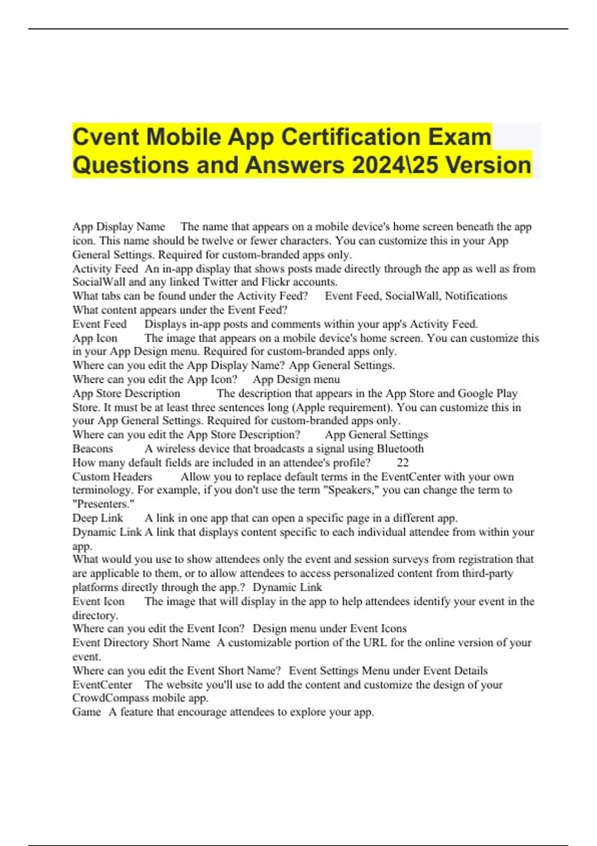 Cvent Mobile App Certification Exam Questions and Answers 202425 Version App Display Name The name that appears on a mobile device's home screen beneath the app icon. This name should be twelve or fewer characters. You can customize this in your App General Settings. Required for custom-branded apps only. Activity Feed An in-app display that shows posts made directly through the app as well as from SocialWall and any linked Twitter and Flickr accounts. What tabs can be found under the Activity Feed? Event Feed, SocialWall, Notifications What content appears under the Event Feed? Event Feed Displays in-app posts and comments within your app's Activity Feed. App Icon The image that appears on a mobile device's home screen. You can customize this in your App Design menu. Required for custom-branded apps only. Where can you edit the App Display Name? App General Settings. Where can you edit the App Icon? App Design menu App Store Description The description that appears in the App Store and Google Play Store. It must be at least three sentences long (Apple requirement). You can customize this in your App General Settings. Required for custom-branded apps only. Where can you edit the App Store Description? App General Settings Beacons A wireless device that broadcasts a signal using Bluetooth How many default fields are included in an attendee's profile? 22 Custom Headers Allow you to replace default terms in the EventCenter with your own terminology. For example, if you don't use the term "Speakers," you can change the term to "Presenters." Deep Link A link in one app that can open a specific page in a different app. Dynamic Link A link that displays content specific to each individual attendee from within your app. What would you use to show attendees only the event and session surveys from registration that are applicable to them, or to allow attendees to access personalized content from third-party platforms directly through the app.? Dynamic Link Event Icon The image that will display in the app to help attendees identify your event in the directory. Where can you edit the Event Icon? Design menu under Event Icons Event Directory Short Name A customizable portion of the URL for the online version of your event. Where can you edit the Event Short Name? Event Settings Menu under Event Details EventCenter The website you'll use to add the content and customize the design of your CrowdCompass mobile app. Game A feature that encourage attendees to explore your app. Geo Locations A point of interest on your map. These locations have a physical street address rather than a room location. Groups Allow you to only show specific content to certain subsets of attendees. Icon Pack The group of themed images that will label each of your navigation icons. Where can you edit your Icon Pack? Design Menu under Theme and Icon Pack Live Q&A Allows attendees to submit questions directly to a session moderator through the app. Maps What can you use to highlight where activities are occurring and exhibitors are located? What type of content can you associate with areas on a map? Sessions and Organizations Navigation Icons Buttons within the app, such as Schedule, Speakers, Exhibitors, and Maps, that allow attendees to access content Online Event Guide Available for attendees using a desktop, laptop or mobile device without access to the App Store or Google Play Store, like a Blackberry or Windows phone. Organizations Exhibitors, companies, or sponsors associated with your event. Pages A type of content that you can use to add more information to the app. What would you use to provide additional resources like Wi-Fi information, directions, offsite activity details, and anything else attendees may need to know in the app? Pages Polls A survey-like feature with a live display of results that can be projected in real time. How many questions can you include in a poll? 1 Push Notifications A message sent to an attendee's device which can be used to inform, remind, or update them about key information. Will attendees still receive push notifications if they do not have the app open? Yes SocialWall Aggregates social posts about your event from Twitter and Flickr into your app's Activity Feed. What accounts can you connect to SocialWall? Twitter & Flickr What content can you set smart galleries to pull into social wall? Any posts from Twitter or Flickr accounts that you have connected and any posts using the hashtags you've specified. What can you use to project your SocialWall live at your event? LiveDisplay - a feature that becomes available with Premium What background will be shown to attendees using a tablet to access the app? Splash Screen Where can you edit the splash screen? EventCenter Design Menu under Splash Screens Sponsorship Levels Allow you to designate organizations as sponsors of your event and highlight them behind your app's navigation icon How many Sponsorship Levels can you add? 10 Subsessions Mini-sessions or breakouts that occur within a parent session. How many Subsessions can you add? As many as you want but recommended no more than 15 Survey A method of retrieving feedback from your attendees. Can surveys be completed offline? Yes, responses will sync automatically once attendee is re-connected to the internet Tags Used to filter content within the schedule or behind a navigation icon. What can Tags be applied to? sessions, speakers, organizations & pages Theme A set of colors used throughout the app Where can you edit the Theme? Design Menu under Theme and Icon Pack
