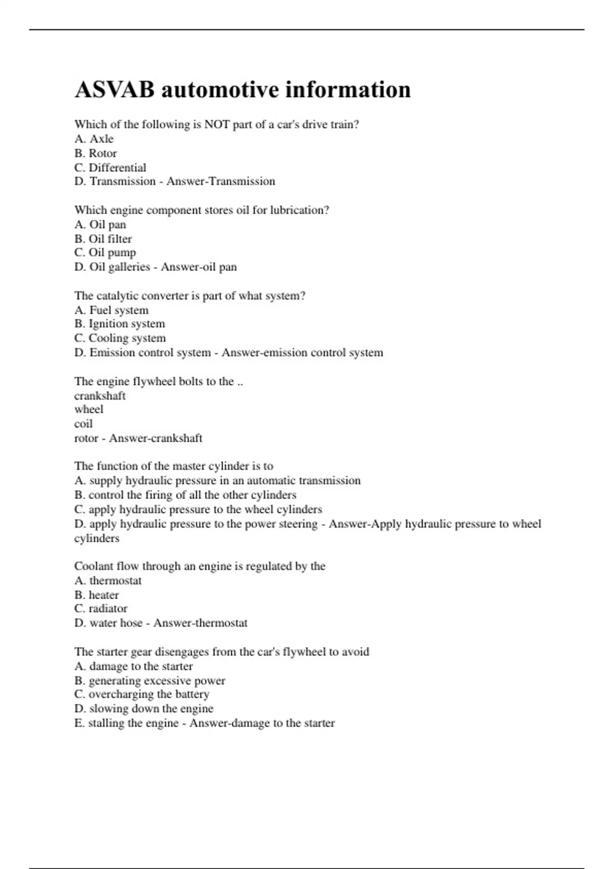 Which of the following is NOT part of a car's drive train? A. Axle B. Rotor C. Differential D. Transmission - Answer-Transmission Which engine component stores oil for lubrication? A. Oil pan B. Oil filter C. Oil pump D. Oil galleries - Answer-oil pan The catalytic converter is part of what system? A. Fuel system B. Ignition system C. Cooling system D. Emission control system - Answer-emission control system The engine flywheel bolts to the .. crankshaft wheel coil rotor - Answer-crankshaft The function of the master cylinder is to A. supply hydraulic pressure in an automatic transmission B. control the firing of all the other cylinders C. apply hydraulic pressure to the wheel cylinders D. apply hydraulic pressure to the power steering - Answer-Apply hydraulic pressure to wheel cylinders Coolant flow through an engine is regulated by the A. thermostat B. heater C. radiator D. water hose - Answer-thermostat The starter gear disengages from the car's flywheel to avoid A. damage to the starter B. generating excessive power C. overcharging the battery D. slowing down the engine E. stalling the engine - Answer-damage to the starter