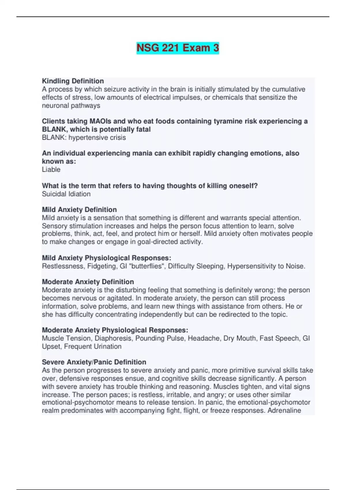 NSG 221 Exam 3 - Questions and Answers Kindling Definition A process by which seizure activity in the brain is initially stimulated by the cumulative effects of stress, low amounts of electrical impulses, or chemicals that sensitize the neuronal pathways Clients taking MAOIs and who eat foods containing tyramine risk experiencing a BLANK, which is potentially fatal BLANK: hypertensive crisis An individual experiencing mania can exhibit rapidly changing emotions, also known as: Liable What is the term that refers to having thoughts of killing oneself? Suicidal Idiation Mild Anxiety Definition Mild anxiety is a sensation that something is different and warrants special attention. Sensory stimulation increases and helps the person focus attention to learn, solve problems, think, act, feel, and protect him or herself. Mild anxiety often motivates people to make changes or engage in goal-directed activity. Mild Anxiety Physiological Responses: Restlessness, Fidgeting, GI "butterflies", Difficulty Sleeping, Hypersensitivity to Noise. Moderate Anxiety Definition Moderate anxiety is the disturbing feeling that something is definitely wrong; the person becomes nervous or agitated. In moderate anxiety, the person can still process information, solve problems, and learn new things with assistance from others. He or she has difficulty concentrating independently but can be redirected to the topic. Moderate Anxiety Physiological Responses: Muscle Tension, Diaphoresis, Pounding Pulse, Headache, Dry Mouth, Fast Speech, GI Upset, Frequent Urination Severe Anxiety/Panic Definition As the person progresses to severe anxiety and panic, more primitive survival skills take over, defensive responses ensue, and cognitive skills decrease significantly. A person with severe anxiety has trouble thinking and reasoning. Muscles tighten, and vital signs increase. The person paces; is restless, irritable, and angry; or uses other similar emotional-psychomotor means to release tension. In panic, the emotional-psychomotor realm predominates with accompanying fight, flight, or freeze responses. Adrenaline surge greatly increases vital signs. Pupils enlarge to let in more light, and the only cognitive process focuses on the person's defense. Severe Anxiety Physiological Response: Severe headache, Nausea, vomiting, and diarrhea, Trembling, Rigid stance, Vertigo, Pale, Tachycardia, Chest pain Panic Physiological Responses: May bolt and run or totally immobile and mute, Dilated pupils, Increased blood pressure and pulse, Flight, fight, or freeze Nursing Interventions Mild Anxiety: Mild anxiety is an asset to the client and requires no direct intervention. People with mild anxiety can learn and solve problems and are even eager for information. Teaching can be effective when the client is mildly anxious. Nursing Interventions Moderate Anxiety: With moderate anxiety, the nurse must be certain that the client is following what the nurse is saying. The client's attention can wander, and he or she may have some difficulty concentrating over time. Speaking in short, simple, and easy-to-understand sentences is effective; the nurse must stop to ensure that the client is still taking in information correctly. The nurse may need to redirect the client back to the topic if the client goes off on a tangent. Nursing Interventions: Panic During panic anxiety, the person's safety is the primary concern. The nurse must keep talking to the person in a comforting manner, even though the client cannot process what the nurse is saying. Going to a small, quiet, and nonstimulating environment may help reduce anxiety. The nurse can reassure the person that this is anxiety, it will pass, and he or she is in a safe place. The nurse should remain with the client until the panic recedes. Panic-level anxiety is not indefinite, but it can last from 5 to 30 minutes. Nursing interventions Severe Anxiety: When anxiety becomes severe, the client can no longer pay attention or take in information. The nurse's goal must be to lower the person's anxiety level to moderate or mild before proceeding with anything else. It is also essential to remain with the person because anxiety is likely to worsen if he or she is left alone. Talking to the client in a low, calm, and soothing voice can help. If the person cannot sit still, walking with him or her while talking can be effective. What the nurse talks about matters less than how he or she says the words. Helping the person take deep even breaths can help lower anxiety. Malingering Malingering is the intentional production of false or grossly exaggerated physical or psychological symptoms; it is motivated by external incentives such as avoiding work, evading criminal prosecution, obtaining financial compensation, or obtaining drugs. People who malinger have no real physical symptoms or grossly exaggerate relatively minor symptoms. Their purpose is some external incentive or outcome that they view as important and results directly from the illness. People who malinger can stop the physical symptoms as soon as they have gained what they wanted Factitious Disorder Factitious disorder, imposed on self, occurs when a person intentionally produces or feigns physical or psychological symptoms solely to gain attention. People with factitious disorder may even inflict injury on themselves to receive attention Munchausen & Munchausen by Proxy The common term for factitious disorder imposed on self is Munchausen syndrome. A variation of factitious disorder, imposed on others, is commonly called Munchausen syndrome by proxy, and occurs when a person inflicts illness or injury on someone else to gain the attention of emergency medical personnel or to be a "hero" for saving the victim Primary Gain Primary gains are the direct internal benefits that being sick provides, such as relief of anxiety, conflict, or distress Secondary Gain Secondary gains are the external or personal benefits received from others because one is sick, s