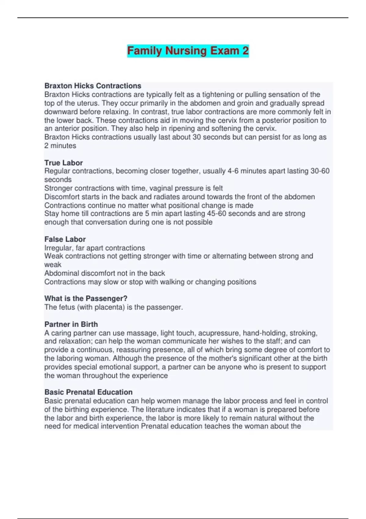 NSG 222 Family Nursing Exam 2 - Questions and Answers Braxton Hicks Contractions Braxton Hicks contractions are typically felt as a tightening or pulling sensation of the top of the uterus. They occur primarily in the abdomen and groin and gradually spread downward before relaxing. In contrast, true labor contractions are more commonly felt in the lower back. These contractions aid in moving the cervix from a posterior position to an anterior position. They also help in ripening and softening the cervix. Braxton Hicks contractions usually last about 30 seconds but can persist for as long as 2 minutes True Labor Regular contractions, becoming closer together, usually 4-6 minutes apart lasting 30-60 seconds Stronger contractions with time, vaginal pressure is felt Discomfort starts in the back and radiates around towards the front of the abdomen Contractions continue no matter what positional change is made Stay home till contractions are 5 min apart lasting 45-60 seconds and are strong enough that conversation during one is not possible False Labor Irregular, far apart contractions Weak contractions not getting stronger with time or alternating between strong and weak Abdominal discomfort not in the back Contractions may slow or stop with walking or changing positions What is the Passenger? The fetus (with placenta) is the passenger. Partner in Birth A caring partner can use massage, light touch, acupressure, hand-holding, stroking, and relaxation; can help the woman communicate her wishes to the staff; and can provide a continuous, reassuring presence, all of which bring some degree of comfort to the laboring woman. Although the presence of the mother's significant other at the birth provides special emotional support, a partner can be anyone who is present to support the woman throughout the experience Basic Prenatal Education Basic prenatal education can help women manage the labor process and feel in control of the birthing experience. The literature indicates that if a woman is prepared before the labor and birth experience, the labor is more likely to remain natural without the need for medical intervention Prenatal education teaches the woman about the childbirth experience and increases her sense of control. She is then able to work as an active participant during the labor and birth experience Vaginal Examination The purpose of performing a vaginal examination is to assess the amount of cervical dilation, the percentage of cervical effacement, and the fetal membrane status and to gather information on presentation, position, station, degree of fetal head flexion, and presence of fetal skull swelling or molding Prepare the woman by informing her about the procedure, what information will be obtained from it, how she can assist with the procedure, how it will be performed, and who will be performing it. Performing Leopold Maneuvers Leopold maneuvers are a method for determining the presentation, position, and lie of the fetus through the use of four specific steps. This method involves inspection and palpation of the maternal abdomen as a screening assessment for malpresentation. The flat palmar surfaces of the nurse's hands with the fingers together palpate the uterus A longitudinal lie is expected, and the presentation can be cephalic, breech, or shoulder. Each maneuver answers a question: · Maneuver 1: What fetal part (head or buttocks) is located in the fundus (top of the uterus)? · Maneuver 2: On which maternal side is the fetal back located? (Fetal heart tones are best auscultated through the back of the fetus.) · Maneuver 3: What is the presenting part? · Maneuver 4: Is the fetal head flexed and engaged in the pelvis? Fetal Assessment During Labor and Birth A fetal assessment identifies well-being or signs that indicate compromise. The character of the amniotic fluid is assessed, but the fetal assessment focuses primarily on determining the FHR pattern. Umbilical cord blood analysis and fetal scalp stimulation are additional assessments performed as necessary in the case of questionable FHR patterns. Analysis of Amniotic Fluid Amniotic fluid should be clear when the membranes rupture. Rupturing of membranes is either spontaneous or artificial by means of an amniotomy, during which a disposable plastic hook (an Amnihook) is used to perforate the amniotic sac. Cloudy or foul-smelling amniotic fluid indicates infection. Green fluid may indicate that the fetus has passed meconium secondary to transient hypoxia, prolonged pregnancy, cord compression, intrauterine growth restriction (IUGR), maternal hypertension, diabetes, or chorioamnionitis; however, it is considered a normal occurrence if the fetus is in a breech presentation. If it is determined that meconium- stained amniotic fluid is due to fetal hypoxia, the maternity and pediatric teams work together to prevent meconium aspiration syndrome, which can lead to respiratory distress. This would necessitate suctioning after the head is born before the infant takes a breath and perhaps direct tracheal suctioning after birth if the Apgar score is low. In some cases, an amnioinfusion (introduction of warmed, sterile normal saline or Ringer's lactate solution into the uterus) is used to dilute moderate to heavy meconium released in utero to assist in preventing meconium aspiration syndrome. Analysis of Fetal Heart Rate Monitoring of the FHR throughout labor and birth is essential to assure fetal well-being to optimize neonatal outcomes. Analysis of the FHR is one of the primary evaluation tools used to determine fetal oxygen status indirectly. FHR assessment can be done intermittently using a fetoscope (a modified stethoscope attached to a headpiece) or a Doppler (ultrasound) device, or continuously with an electronic fetal monitor applied externally or internally Category 1 Fetal Heart Rate Category 1 Normal: Baseline 110-160 bpm Baseline variability moderate Present or absent accelerations Present or absent early deceleration