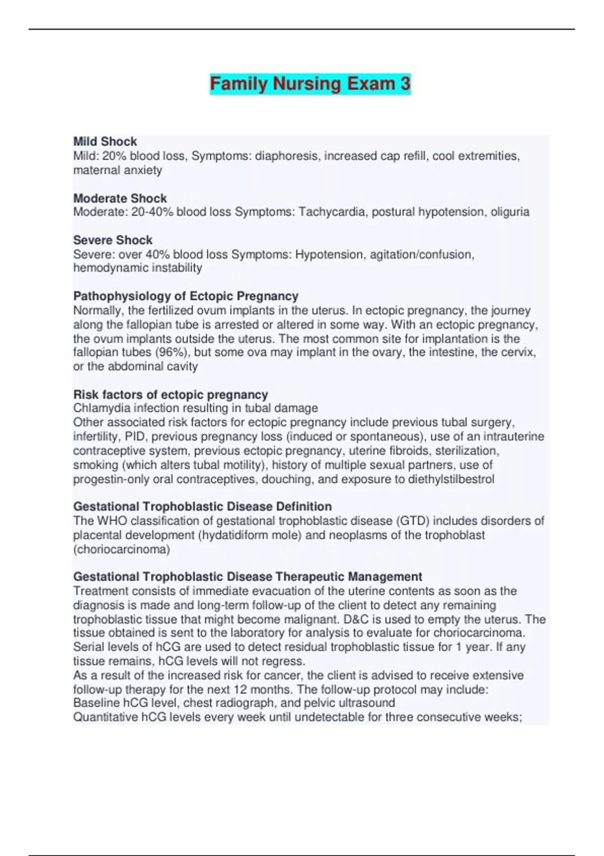 NSG 222 Family Nursing Exam 3 - Questions and Answers Mild Shock Mild: 20% blood loss, Symptoms: diaphoresis, increased cap refill, cool extremities, maternal anxiety Moderate Shock Moderate: 20-40% blood loss Symptoms: Tachycardia, postural hypotension, oliguria Severe Shock Severe: over 40% blood loss Symptoms: Hypotension, agitation/confusion, hemodynamic instability Pathophysiology of Ectopic Pregnancy Normally, the fertilized ovum implants in the uterus. In ectopic pregnancy, the journey along the fallopian tube is arrested or altered in some way. With an ectopic pregnancy, the ovum implants outside the uterus. The most common site for implantation is the fallopian tubes (96%), but some ova may implant in the ovary, the intestine, the cervix, or the abdominal cavity Risk factors of ectopic pregnancy Chlamydia infection resulting in tubal damage Other associated risk factors for ectopic pregnancy include previous tubal surgery, infertility, PID, previous pregnancy loss (induced or spontaneous), use of an intrauterine contraceptive system, previous ectopic pregnancy, uterine fibroids, sterilization, smoking (which alters tubal motility), history of multiple sexual partners, use of progestin-only oral contraceptives, douching, and exposure to diethylstilbestrol Gestational Trophoblastic Disease Definition The WHO classification of gestational trophoblastic disease (GTD) includes disorders of placental development (hydatidiform mole) and neoplasms of the trophoblast (choriocarcinoma) Gestational Trophoblastic Disease Therapeutic Management Treatment consists of immediate evacuation of the uterine contents as soon as the diagnosis is made and long-term follow-up of the client to detect any remaining trophoblastic tissue that might become malignant. D&C is used to empty the uterus. The tissue obtained is sent to the laboratory for analysis to evaluate for choriocarcinoma. Serial levels of hCG are used to detect residual trophoblastic tissue for 1 year. If any tissue remains, hCG levels will not regress. As a result of the increased risk for cancer, the client is advised to receive extensive follow-up therapy for the next 12 months. The follow-up protocol may include: Baseline hCG level, chest radiograph, and pelvic ultrasound Quantitative hCG levels every week until undetectable for three consecutive weeks; then serial hCG levels monthly for 1 year Chest radiograph every 6 months to detect pulmonary metastasis Regular pelvic examinations to assess uterine and ovarian regression Systemic assessments for symptoms indicative of lung, brain, liver, or vaginal metastasis Strong recommendation to avoid pregnancy for 1 year because the pregnancy can interfere with the monitoring of hCG levels Use of a reliable contraceptive for at least 1 year Gestational Trophoblastic Disease Nursing Assessment The nurse plays a crucial role in identifying and bringing this condition to the attention of the health care provider based on sound knowledge of the typical clinical manifestations and astute prenatal assessments. Clinical manifestations of GTD are similar to those of spontaneous abortion at about 12 weeks of pregnancy. Assess the woman for potential clinical manifestations at each prenatal visit. Be alert for the following: Report of early signs of pregnancy, such as amenorrhea, breast tenderness, fatigue Brownish vaginal bleeding/spotting Anemia Inability to detect a fetal heart rate after 10 to 12 weeks' gestation Fetal parts not evident with palpation Bilateral ovarian enlargement caused by cysts and elevated levels of hCG Persistent, often severe nausea and vomiting (due to high hCG levels) Fluid retention and swelling Uterine size larger than expected for pregnancy dates Extremely high hCG levels present; no single value considered diagnostic Early development of preeclampsia (usually not present until after 24 weeks) Absence of fetal heart rate or fetal activity Expulsion of grape-like vesicles (possible in some women) The diagnosis is made by high hCG levels and the characteristic appearance of the vesicular molar pattern in the uterus via transvaginal ultrasound. Cervical Insufficiency patio The exact mechanism contributing to cervical insufficiency is not known. The cervix may have less elastin, less collagen, and greater amounts of smooth muscle than the normal cervix and thus results in loss of sphincter tone. Structural cervical weakness is the likely cause of many recurrent second-trimester losses, but not the only etiology. Cervical length has also been associated with cervical insufficiency and subsequently preterm birth. Recent studies have examined the association between a short cervical length and the risk of preterm birth. Cervical Insufficiency Therapeutic Management Cervical insufficiency may be treated with bed rest; pelvic rest; avoidance of heavy lifting; progesterone supplementation in women at risk for preterm birth; placement of a cervical pessary (a round, silicone device at the mouth of the cervix); or surgically via a cervical cerclage procedure in the second trimester. Cerclage was created more than 50 years ago based on the hypothesis that for some women, weakness or malfunction of the cervix has a causative role in the pathway to preterm birth. It can either be performed transvaginally or transabdominally. Cervical cerclage involves using a heavy purse-string suture to secure and reinforce the internal os of the cervix Placenta Previa Monitoring Maternal and Fetal Status Avoid doing vaginal examinations in the woman with placenta previa because they may disrupt the placenta and cause hemorrhage. Assess the degree of vaginal bleeding; inspect the perineal area for blood that may be pooled underneath the woman. Estimate and document the amount of bleeding. Perform a peripad count on an ongoing basis, making sure to report any changes in amount or frequency to the health care provider. If the woman is experiencing active bleeding, prepare for blood typing and cross-match