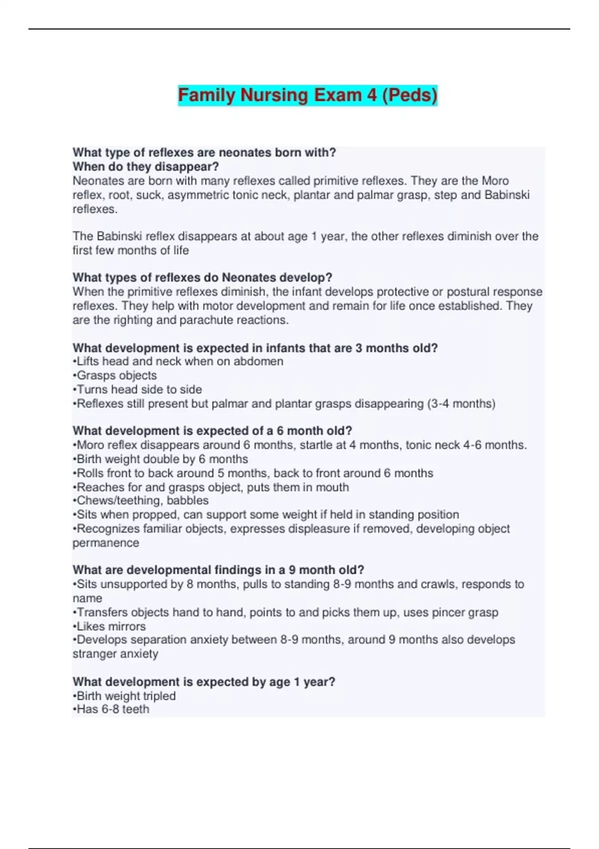 NSG 222 Family Nursing Exam 4 (Peds) - Questions and Answers What type of reflexes are neonates born with? When do they disappear? Neonates are born with many reflexes called primitive reflexes. They are the Moro reflex, root, suck, asymmetric tonic neck, plantar and palmar grasp, step and Babinski reflexes. The Babinski reflex disappears at about age 1 year, the other reflexes diminish over the first few months of life What types of reflexes do Neonates develop? When the primitive reflexes diminish, the infant develops protective or postural response reflexes. They help with motor development and remain for life once established. They are the righting and parachute reactions. What development is expected in infants that are 3 months old? •Lifts head and neck when on abdomen •Grasps objects •Turns head side to side •Reflexes still present but palmar and plantar grasps disappearing (3-4 months) What development is expected of a 6 month old? •Moro reflex disappears around 6 months, startle at 4 months, tonic neck 4-6 months. •Birth weight double by 6 months •Rolls front to back around 5 months, back to front around 6 months •Reaches for and grasps object, puts them in mouth •Chews/teething, babbles •Sits when propped, can support some weight if held in standing position •Recognizes familiar objects, expresses displeasure if removed, developing object permanence What are developmental findings in a 9 month old? •Sits unsupported by 8 months, pulls to standing 8-9 months and crawls, responds to name •Transfers objects hand to hand, points to and picks them up, uses pincer grasp •Likes mirrors •Develops separation anxiety between 8-9 months, around 9 months also develops stranger anxiety What development is expected by age 1 year? •Birth weight tripled •Has 6-8 teeth •Knows name •Cruises or walks when 1 hand held •Places object in container •May have security object •Drink from cup and use spoon but prefers fingers What toys are appropriate for ages 1-4 months? •Age 1-4 months: mobile, mirrors, rattles, music/singing, high-contrast patterns in books What toys are appropriate for 4-7 months? 4-7 months: fabric/board books, music, toys that do things and are easy to hold, toys that float or squirt water, soft dills/animals What toys are appropriate for 6-12 months? 6-12 months: plastic cups, bowls or buckets, mirror, blocks, stacking toys, busy boxes, balls, dolls, toy phone, push-pull toys, board books with pictures What factors are important for infant nutrition? Infants should have breast milk or formula until age 6 months. Solid foods can be introduced around 6 months, introducing 1 new food a week. Continue breast milk or formula until age 1 year. Then the infant can be switched to whole milk. What is safety related to infant care? •Keep small objects or hard foods out of reach. Cover outlets, protect from falls, prevent poisoning from medications or household chemicals. Never leave unattended by water. Car seat should be rear facing throughout infancy and in the back seat. Crib should have firm mattress that fits snugly in crib What are some developmental concerns related to growth/development in the infant period? Colic Spitting up Thumb Sucking Teething Pain How to address Colic? (Infant developmental concerns) •inconsolable crying that lasts 3 hours or more. It happens more often in the evening and usually resolves around 3 months of age. Parents should develop stepwise approach to make sure the basic needs are met. When needs are met, they attempt to soothe by reducing stimulation, carrying, swings/vibration, pacifier (try 1 intervention at a time). How to address spitting up? (Infant developmental concerns) •normal after feedings. Encourage to burp frequently and keep upright (not in a seat) for 30 minutes after feeding. How to address thumb sucking/security? (Infant developmental concerns) •thumb sucking is a healthy, self-comforting activity. Pacifiers work but can be linked to increased incidence of otitis. If use pacifier, wean by age 2-3 or can negatively affect teeth. If have security object, wean after infancy. How to address teething pain? (Infant developmental concerns) •application of cold can be soothing, over-the-counter topical anesthetics may be helpful Piaget Infant Development •sensorimotor, uses senses to explore the world. Discusses separation anxiety, object permanence, ability to use symbols Erikson Infant Development •Trust vs mistrust, infant develops trust when needs met. Caregivers learn infant signals and responds to them to meet needs, signals include crying, cooing and facial expressions Freud Infant Development •oral stage, sexual urges gratified through mouth What type of discipline is appropriates in infants? •Setting limits for safety •Reward good behavior (Positive reinforcement) •Be consistent •Maintain routines What are expectations related to growth in toddlers? •Weight: gain 3-5 pounds a year •Height: grow about 3 inches per year, reach half of adult height by age 2. •Head circumference: grows 1 inch between ages 1 and 2, then half an inch per year until age 5 •Anterior fontanel should be closed by age 18 months Developmental Expectations by 15 months •Walks alone by 15 months, creeps up stairs, begins to run, uses cup, builds tower of 2 blocks Developmental Expectations by 18 months •kicks a ball, jumps in place with both feet, uses push-pull toys (toys they can manipulate), builds tower of 3-4 blocks