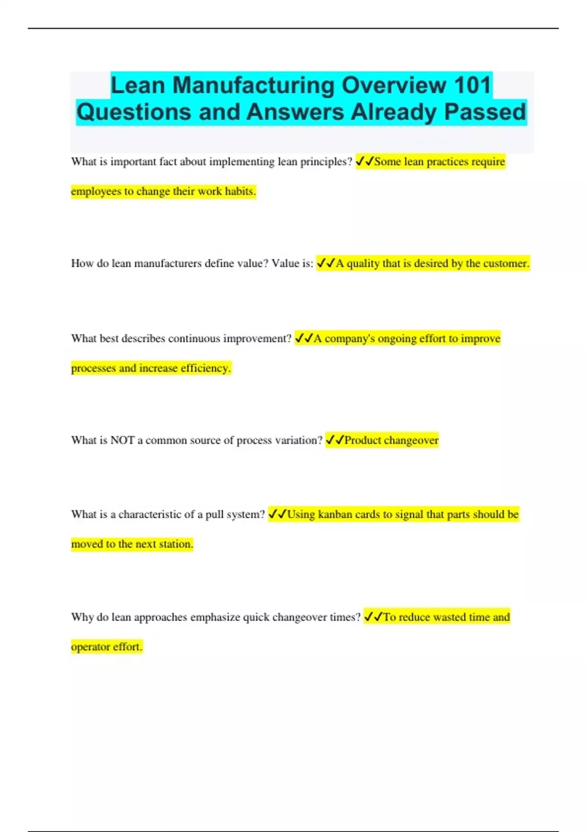 Lean Manufacturing Overview 101 Questions and Answers Already Passed