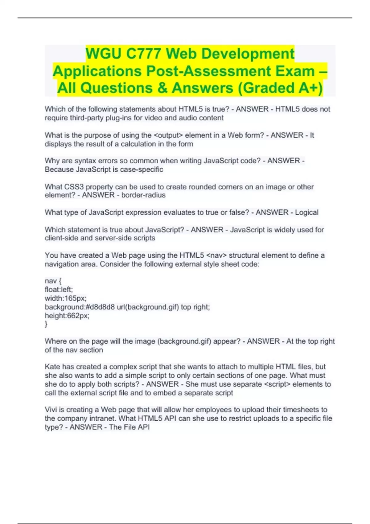 WGU C777 Web Development Applications Post-Assessment Exam – All Questions & Answers (Graded A+) WGU C777 Web Development Applications Post-Assessment Exam – All Questions & Answers (Graded A+) Which of the following statements about HTML5 is true? - ANSWER - HTML5 does not require third-party plug-ins for video and audio content What is the purpose of using the <output> element in a Web form? - ANSWER - It displays the result of a calculation in the form Why are syntax errors so common when writing JavaScript code? - ANSWER - Because JavaScript is case-specific What CSS3 property can be used to create rounded corners on an image or other element? - ANSWER - border-radius What type of JavaScript expression evaluates to true or false? - ANSWER - Logical Which statement is true about JavaScript? - ANSWER - JavaScript is widely used for client-side and server-side scripts You have created a Web page using the HTML5 <nav> structural element to define a navigation area. Consider the following external style sheet code: nav { float:left; width:165px; background:#d8d8d8 url() top right; height:662px; } Where on the page will the image () appear? - ANSWER - At the top right of the nav section Kate has created a complex script that she wants to attach to multiple HTML files, but she also wants to add a simple script to only certain sections of one page. What must she do to apply both scripts? - ANSWER - She must use separate <script> elements to call the external script file and to embed a separate script Vivi is creating a Web page that will allow her employees to upload their timesheets to the company intranet. What HTML5 API can she use to restrict uploads to a specific file type? - ANSWER - The File API