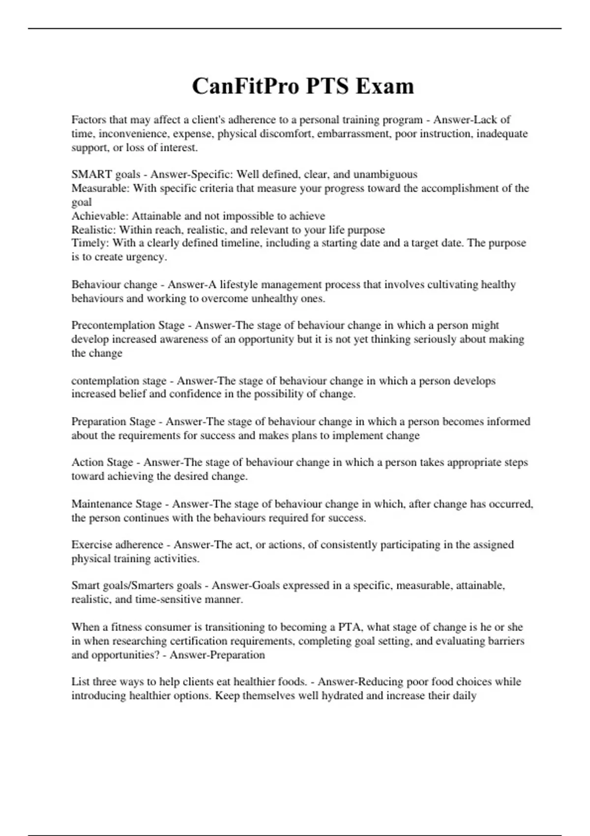 Factors that may affect a client's adherence to a personal training program - Answer-Lack of time, inconvenience, expense, physical discomfort, embarrassment, poor instruction, inadequate support, or loss of interest. SMART goals - Answer-Specific: Well defined, clear, and unambiguous Measurable: With specific criteria that measure your progress toward the accomplishment of the goal Achievable: Attainable and not impossible to achieve Realistic: Within reach, realistic, and relevant to your life purpose Timely: With a clearly defined timeline, including a starting date and a target date. The purpose is to create urgency. Behaviour change - Answer-A lifestyle management process that involves cultivating healthy behaviours and working to overcome unhealthy ones. Precontemplation Stage - Answer-The stage of behaviour change in which a person might develop increased awareness of an opportunity but it is not yet thinking seriously about making the change contemplation stage - Answer-The stage of behaviour change in which a person develops increased belief and confidence in the possibility of change. Preparation Stage - Answer-The stage of behaviour change in which a person becomes informed about the requirements for success and makes plans to implement change Action Stage - Answer-The stage of behaviour change in which a person takes appropriate steps toward achieving the desired change. Maintenance Stage - Answer-The stage of behaviour change in which, after change has occurred, the person continues with the behaviours required for success. Exercise adherence - Answer-The act, or actions, of consistently participating in the assigned physical training activities. Smart goals/Smarters goals - Answer-Goals expressed in a specific, measurable, attainable, realistic, and time-sensitive manner. When a fitness consumer is transitioning to becoming a PTA, what stage of change is he or she in when researching certification requirements, completing goal setting, and evaluating barriers and opportunities? - Answer-Preparation List three ways to help clients eat healthier foods. - Answer-Reducing poor food choices while introducing healthier options. Keep themselves well hydrated and increase their daily