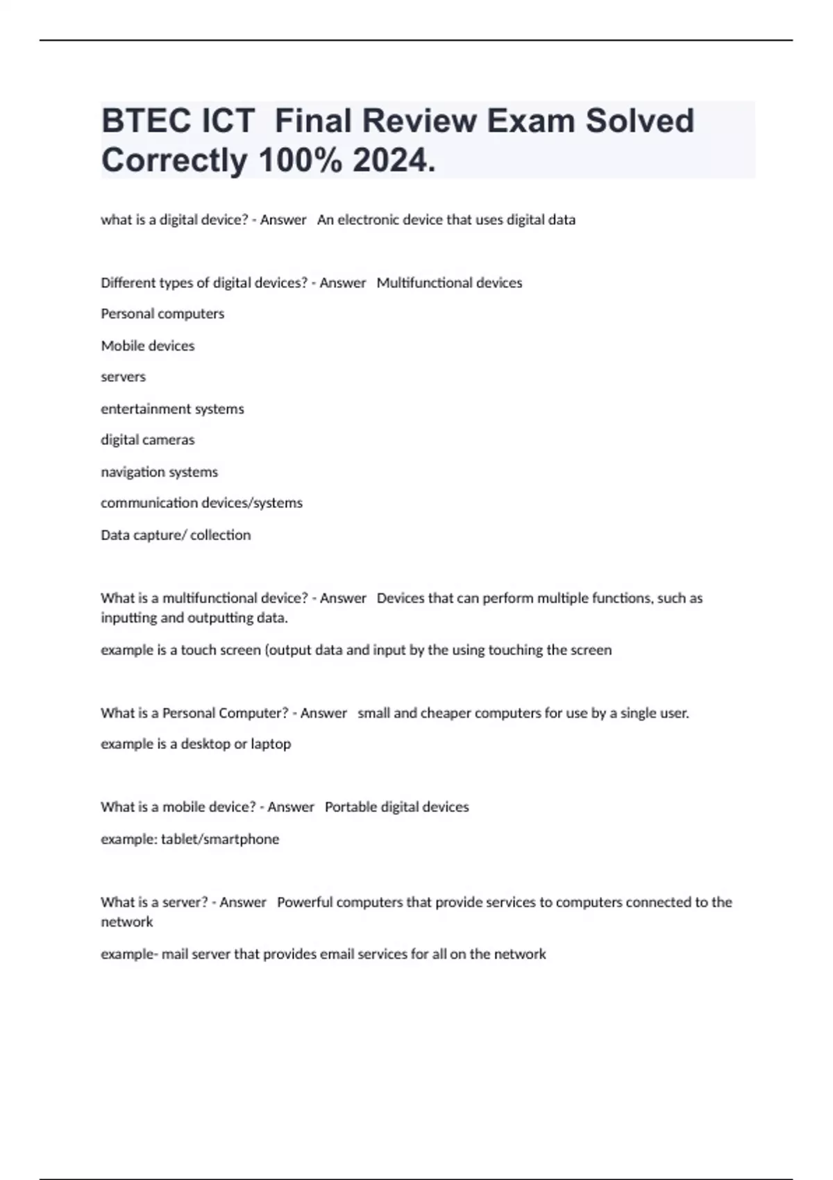 what is a digital device? - Answer An electronic device that uses digital data Different types of digital devices? - Answer Multifunctional devices Personal computers Mobile devices servers entertainment systems digital cameras navigation systems communication devices/systems Data capture/ collection What is a multifunctional device? - Answer Devices that can perform multiple functions, such as inputting and outputting data. example is a touch screen (output data and input by the using touching the screen What is a Personal Computer? - Answer small and cheaper computers for use by a single user. example is a desktop or laptop What is a mobile device? - Answer Portable digital devices example: tablet/smartphone What is a server? - Answer Powerful computers that provide services to computers connected to the network example- mail server that provides email services for all on the network