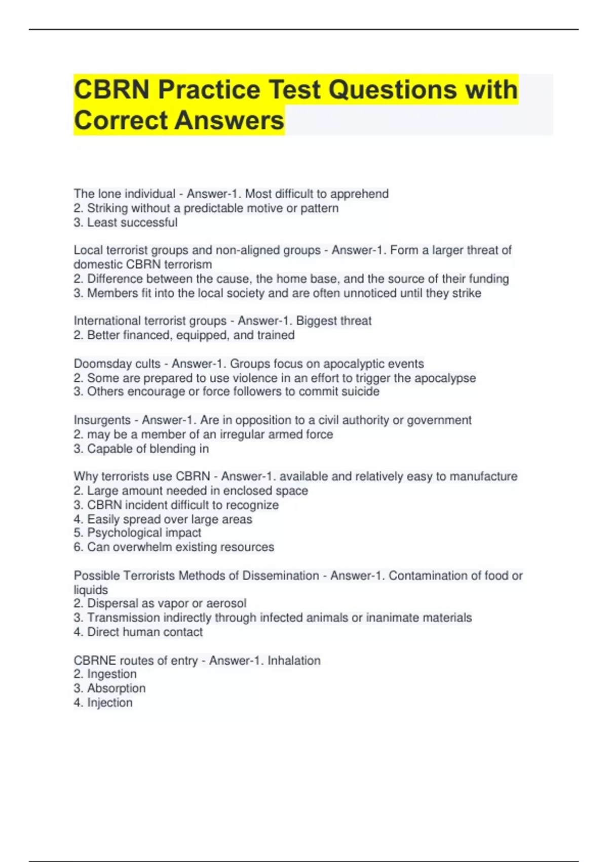 CBRN Practice Test Questions with Correct Answers The lone individual - Answer-1. Most difficult to apprehend 2. Striking without a predictable motive or pattern 3. Least successful Local terrorist groups and non-aligned groups - Answer-1. Form a larger threat of domestic CBRN terrorism 2. Difference between the cause, the home base, and the source of their funding 3. Members fit into the local society and are often unnoticed until they strike International terrorist groups - Answer-1. Biggest threat 2. Better financed, equipped, and trained Doomsday cults - Answer-1. Groups focus on apocalyptic events 2. Some are prepared to use violence in an effort to trigger the apocalypse 3. Others encourage or force followers to commit suicide Insurgents - Answer-1. Are in opposition to a civil authority or government 2. may be a member of an irregular armed force 3. Capable of blending in Why terrorists use CBRN - Answer-1. available and relatively easy to manufacture 2. Large amount needed in enclosed space 3. CBRN incident difficult to recognize 4. Easily spread over large areas 5. Psychological impact 6. Can overwhelm existing resources Possible Terrorists Methods of Dissemination - Answer-1. Contamination of food or liquids 2. Dispersal as vapor or aerosol 3. Transmission indirectly through infected animals or inanimate materials 4. Direct human contact CBRNE routes of entry - Answer-1. Inhalation 2. Ingestion 3. Absorption 4. Injection Different types of Nerve agents - Answer-1. GA 2. Sarin GB 3. Soman GD 4. GF 5. VX G Series Nerve Agents - Answer-1. are volatile and non-persistent 2. Are called G series because they originated in Germany V series nerve agents - Answer-1.Slightly volatile and persistent 2. Death will occur within 15 minutes of fatal V series dosage Mild symptoms of Nerve agents - Answer-1. Headache 2. difficulty seeing 3. runny nose 4. saliva/drooling 5. Tightness of chest 6. Muscular twitching 7. Stomach cramps 8. Nausea Severe symptoms of Nerve agents - Answer-1. Confused behavior 2. Red eyes 3. pinpointed pupils 4. Gurgling sounds 5. Vomiting 6. Loss of bladder control 7Convulsions 8. Unconsciousness or stoppage of breathing 9. Causalities with severe symptoms can't treat themselves Blister agents or vesicant agents - Answer-1. Likely used to produce causalities to force opposing troops to wear full protective equipment 2. Can be thickened to contaminate terrain, ships, aircraft, etc. Vesicant Agents include - Answer-1. Sulfur mustard 2. Nitrogen mustard Arsenical vesicants - Answer-1. Lexisite 2. Halogenated oximes Choking Pulmonary agents - Answer-1. Chemical agents that attack lung tissue 2. Irritation of the bronchi, trachea, larynx, pharynx and nose 3. Consist of Phosgene CG, diphosgene DP, chlorine, and Chloropicrin PS Blood agents examples - Answer-1. Hydrogen cyanide AC 2. Cyanogen chloride CK Blood agents lower concentration symptoms - Answer-1. weakness of legs, dizziness, nausea and headache 2. May be followed by convulsions and coma Blood agents of moderate exposure - Answer-1. Dizziness 2. Nausea and vomiting 3. Headache 4. increased respiration 5. Reddening of lips and skin 6. Convulsions 7. Coma Severe exposure of blood agents - Answer-1. Increased respiration 1-2 seconds 2. Violent convulsions 29-30 seconds 3. Cessation of respiration 1 minute 4. Cessation of heart action few minutes WW1 chemical warfare usage - Answer-1. 1915- Germans used the choking agent chlorine and phosgene 2. 1917- Germans used first blister agent, mustard State use of chemical warfare agents - Answer-1. 1980 to 1989- Iraq used blister and nerve against Iranians 2. Iraq used nerve and other agents against the Kurds Terrorist use of chemical weapons - Answer-March 20, 1995- Poisonous gas sarin developed by Nazi Germany during World War II History of Biological agents - Answer-1. Decaying animals carcasses to contaminate wells go back over 2,000 years 2, In middle ages, bodies of plague victims catapulted into cities to cause sickness and death 3. World War 1 German agents in Baltimore attmpted to infect allied houses with anthrax and glanders Biological warfare research in WWII - Answer-1. Japan's General Ishi was developing bilogical warfare research program. Unit 731 used some of resulting agents against China 2. Japan also experimented with chemical agents