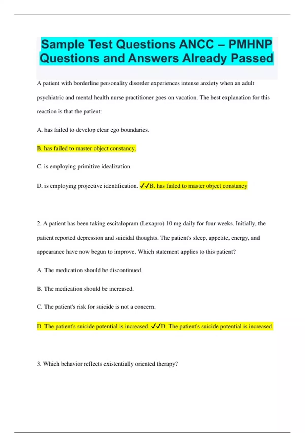Sample Test Questions ANCC – PMHNP Questions and Answers Already Passed A patient with borderline personality disorder experiences intense anxiety when an adult psychiatric and mental health nurse practitioner goes on vacation. The best explanation for this reaction is that the patient: A. has failed to develop clear ego boundaries. B. has failed to master object constancy. C. is employing primitive idealization. D. is employing projective identification. B. has failed to master object constancy 2. A patient has been taking escitalopram (Lexapro) 10 mg daily for four weeks. Initially, the patient reported depression and suicidal thoughts. The patient's sleep, appetite, energy, and appearance have now begun to improve. Which statement applies to this patient? A. The medication should be discontinued. B. The medication should be increased. C. The patient's risk for suicide is not a concern. D. The patient's suicide potential is increased. D. The patient's suicide potential is increased. 3. Which behavior reflects existentially oriented therapy? A. Attempting to understand a patient's subjective world B. Challenging a patient's irrational beliefs C. Developing specific plans for change D. Establishing general group goals A. Attempting to understand a patient's subjective world 4. Serving as a member on a crisis team, an adult psychiatric and mental health nurse practitioner provides crisis intervention to the survivors of a plane crash. Forty-eight hours after the accident, the survivors describe vivid flashbacks, startle reactions, and disrupted sleep patterns. The nurse practitioner responds by: A. advising the survivors to consider using a hypnotic medication for a brief period. B. educating the survivors about prodromal symptoms of posttraumatic stress disorder. C. encouraging the survivors to rest during the day. D. suggesting that the survivors join a posttrauma support group. B. educating the survivors about prodromal symptoms of posttraumatic stress disorder. 5. An adult psychiatric and mental health nurse practitioner uses the interpersonal therapy model with a patient to establish a therapeutic alliance based upon empathy and trust. The nurse practitioner recognizes the patient's readiness to terminate therapy when the patient demonstrates: A. an understanding that leaving a significant other may be painful, but also presents an opportunity for growth. B. breathing and muscle relaxation exercises that decrease muscle tension and anxiety. C. free association, and considers the nurse practitioner's interpretation of the patient's dreams. D. new adaptive skills and responses after completing "homework assignments." A. an understanding that leaving a significant other may be painful, but also presents an opportunity for growth. 6. An Hispanic patient informs an adult psychiatric and mental health nurse practitioner during a wellness visit that he or she occasionally uses hot chili juice to relieve a "nervous condition." The patient denies any complaints related to this practice. The nurse practitioner's response is to: A. actively discourage the patient from continuing this treatment. B. offer a medication to treat the nervous condition. C. suggest an alternative food to relieve the nervous condition. D. view this as a self-care ritual that needs to be preserved. D. view this as a self-care ritual that needs to be preserved. 7. Before an older adult patient initiates pharmacotherapy with a medication that is cleared by the kidneys, an adult psychiatric and mental health nurse practitioner assesses the patient's: A. blood urea nitrogen level. B. creatinine clearance. C. specific gravity. D. urinary sediment. B. creatinine clearance. 8. An adult psychiatric and mental health nurse practitioner uses a cognitive-behavioral approach to help an adolescent patient change self-defeating