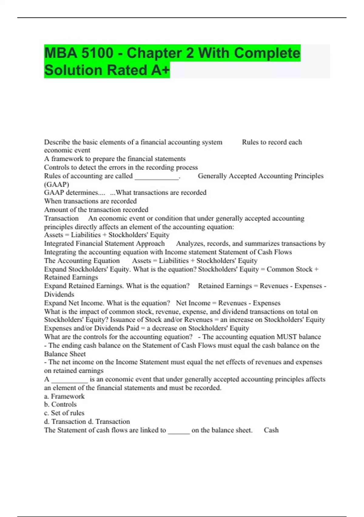 MBA 5100 - Chapter 2 With Complete Solution Rated A+ Describe the basic elements of a financial accounting system Rules to record each economic event A framework to prepare the financial statements Controls to detect the errors in the recording process Rules of accounting are called ____________. Generally Accepted Accounting Principles (GAAP) GAAP determines.... ...What transactions are recorded When transactions are recorded Amount of the transaction recorded Transaction An economic event or condition that under generally accepted accounting principles directly affects an element of the accounting equation: Assets = Liabilities + Stockholders' Equity Integrated Financial Statement Approach Analyzes, records, and summarizes transactions by Integrating the accounting equation with Income statement Statement of Cash Flows The Accounting Equation Assets = Liabilities + Stockholders' Equity Expand Stockholders' Equity. What is the equation? Stockholders' Equity = Common Stock + Retained Earnings Expand Retained Earnings. What is the equation? Retained Earnings = Revenues - Expenses - Dividends Expand Net Income. What is the equation? Net Income = Revenues - Expenses What is the impact of common stock, revenue, expense, and dividend transactions on total on Stockholders' Equity? Issuance of Stock and/or Revenues = an increase on Stockholders' Equity Expenses and/or Dividends Paid = a decrease on Stockholders' Equity What are the controls for the accounting equation? - The accounting equation MUST balance - The ending cash balance on the Statement of Cash Flows must equal the cash balance on the Balance Sheet - The net income on the Income Statement must equal the net effects of revenues and expenses on retained earnings A __________ is an economic event that under generally accepted accounting principles affects an element of the financial statements and must be recorded. a. Framework b. Controls c. Set of rules d. Transaction d. Transaction The Statement of cash flows are linked to ______ on the balance sheet. Cash Net Income from the Income Statement is linked to _____ _____ _____. Retained Earnings Statement Retained Earnings is linked to the ______ ______ in ___________ _________. Balance Sheet; Stockholders' Equity Which of the following will NOT cause a change in the shareholder's equity of a business? a. Payment of a business debt. b. Payment of dividends. c. Sale of land at a profit. d. Losses from unprofitable operations. a. Payment of a business debt. The statement of cash flows is integrated with the balance sheet because a. the cash at the beginning of the period plus or minus the cash flows from operating, investing and financing activities equals the end of period cash reported on the balance sheet b. the cash at the beginning of the period plus or minus the net income equals the end of period cash reported on the balance sheet c. the cash at the beginning of the period plus or minus assets and liabilities equals the end of period cash reported on the balance sheet d. the cash at the beginning of the period plus or minus the cash flows from operating activities equals the end of period cash reported on the balance sheet a. the cash at the beginning of the period plus or minus the cash flows from operating, investing and financing activities equals the end of period cash reported on the balance sheet Johnson, Inc. issued $150,000 in capital stock in exchange for cash. What is the effect of this transaction? a. Total assets remain unchanged. b. Cash flow from Financing Activities will increase. c. Net Income will increase. d. Total Retained Earnings will increase. b. Cash flow from Financing Activities will increase. Rush Corporation repaid a $25,000 loan from the bank. Which of the following accurately shows the effects of the transaction? a. Increase cash $25,000 and decrease notes payable $25,000 b. Increase cash $25,000 and increase notes payable $25,000 c. Decrease cash $25,000 and decrease notes payable $25,000 d. Decrease cash $25,000 and increase notes payable $25,000 c. Decrease cash $25,000 and decrease notes payable $25,000 A transaction caused a $60,000 increase in both assets and total liabilities. This transaction could have been which of the following? a. Purchase for office equipment for $60,000 cash. b. Purchase of office equipment for $120,000, paying $60,000 cash and issuing a note payable for the balance. c. Repayment of a $60,000 bank loan. d. Investment of $60,000 cash in the business by the owner. b. Purchase of office equipment for $120,000, paying $60,000 cash and issuing a note payable for the balance. Zeller Corporation engaged in the following transaction "Sold a building for $80,000 cash." On the Statement of Cash Flows, the transaction would be classified as __________. a. Cash Flows from Operating Activities. b. Cash Flows from Investing Activities.