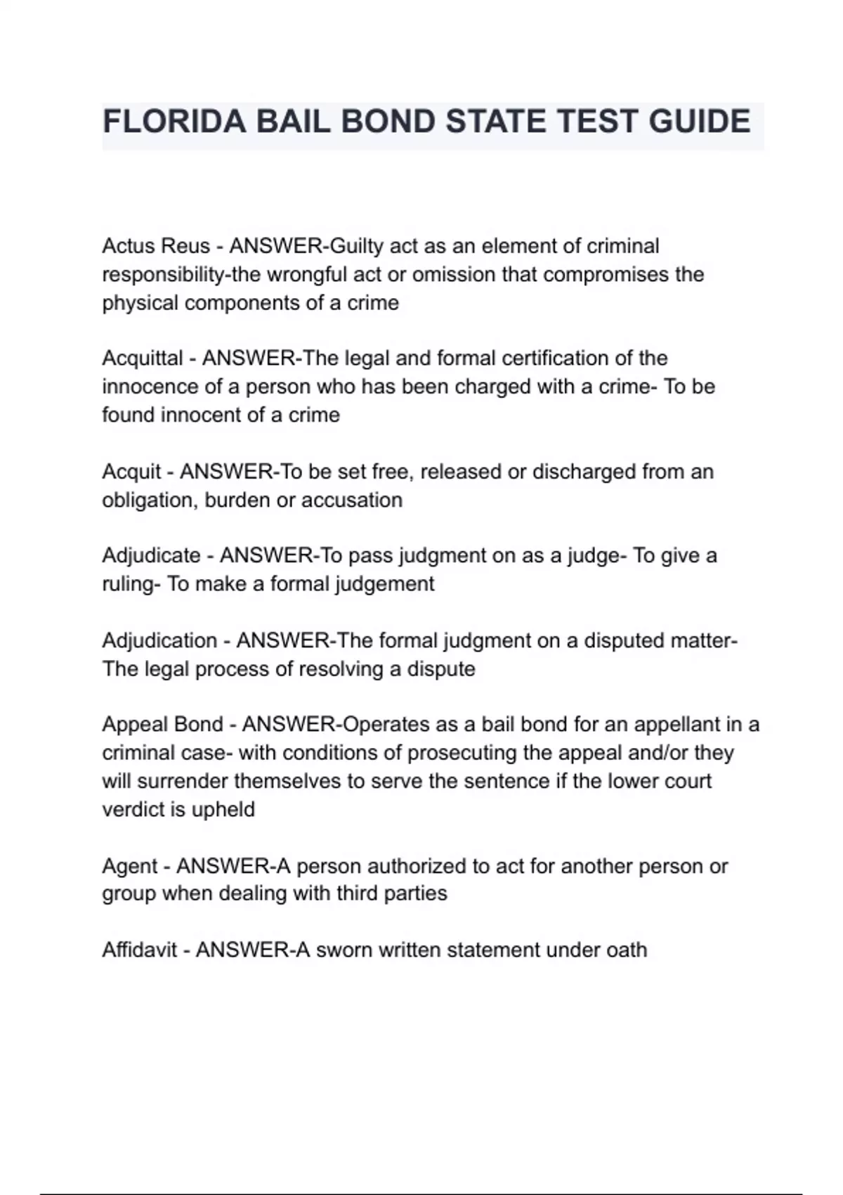 FLORIDA BAIL BOND STATE TEST GUIDE Actus Reus - ANSWER-Guilty act as an element of criminal responsibility-the wrongful act or omission that compromises the physical components of a crime Acquittal - ANSWER-The legal and formal certification of the innocence of a person who has been charged with a crime- To be found innocent of a crime Acquit - ANSWER-To be set free, released or discharged from an obligation, burden or accusation Adjudicate - ANSWER-To pass judgment on as a judge- To give a ruling- To make a formal judgement Adjudic