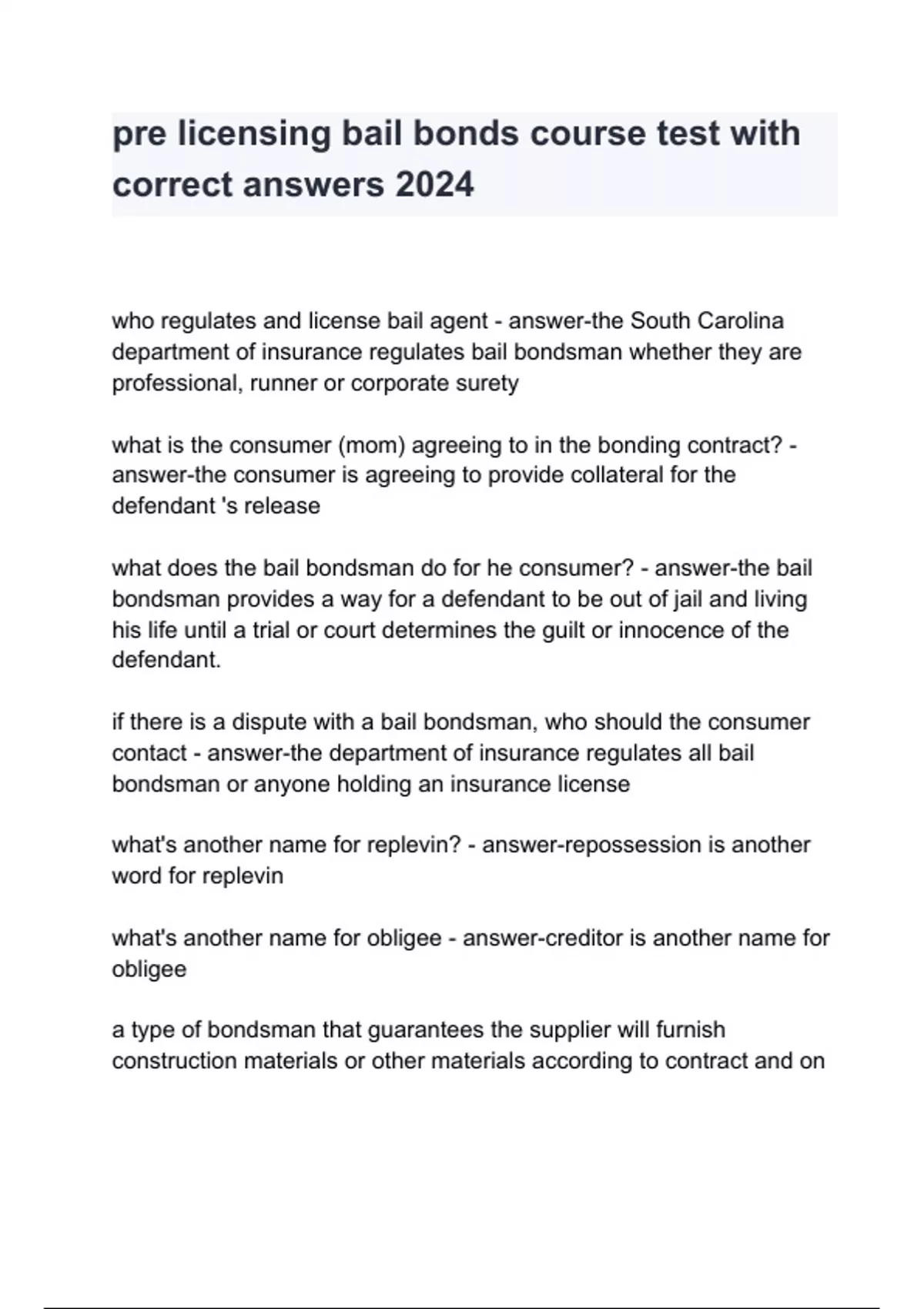 pre licensing bail bonds course test with correct answers 2024 who regulates and license bail agent - answer-the South Carolina department of insurance regulates bail bondsman whether they are professional, runner or corporate surety what is the consumer (mom) agreeing to in the bonding contract? - answer-the consumer is agreeing to provide collateral for the defendant 's release what does the bail bondsman do for he consumer? - answer-the bail bondsman provides a way for a defendant to be out of jail and living his life until a trial or court determines the guilt or innocence of the defendant. if there is a dispute with a bail bondsman, who should the consumer contact