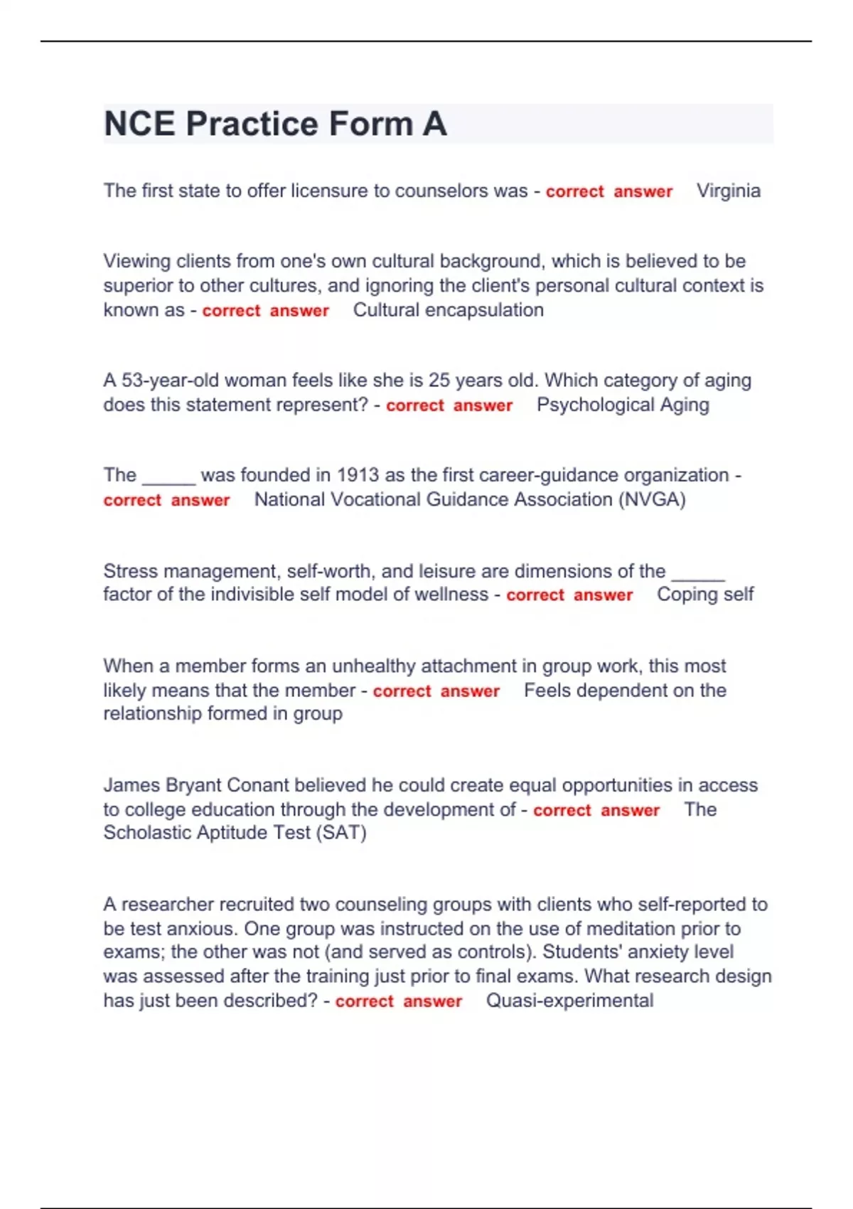 NCE Practice Form A Question and answers correctly solved 2024 The first state to offer licensure to counselors was - correct answer Virginia Viewing clients from one's own cultural background, which is believed to be superior to other cultures, and ignoring the client's personal cultural context is known as - correct answer Cultural encapsulation A 53-year-old woman feels like she is 25 years old. Which category of aging does this statement represent? - correct answer Psychological Aging The _____ was founded in 1913 as the first career-guidance organization - correct answer National Vocational Guidance Association (NVGA) Stress management, self-worth, and leisure are dimensions of the _____ factor of the indivisible self model of wellness - correct answer Coping self When a member forms an unhealthy attachment in group work, this most likely means that the member - correct answer Feels dependent on the relationship formed in group James Bryant Conant believed he could create equal opportunities in access to college education through the development of - correct answer The Scholastic Aptitude Test (SAT) A researcher recruited two counseling groups with clients who self-reported to be test anxious. One group was instructed on the use of meditation prior to exams; the other was not (and served as controls). Students' anxiety level was assessed after the training just prior to final exams. What research design has just been describe