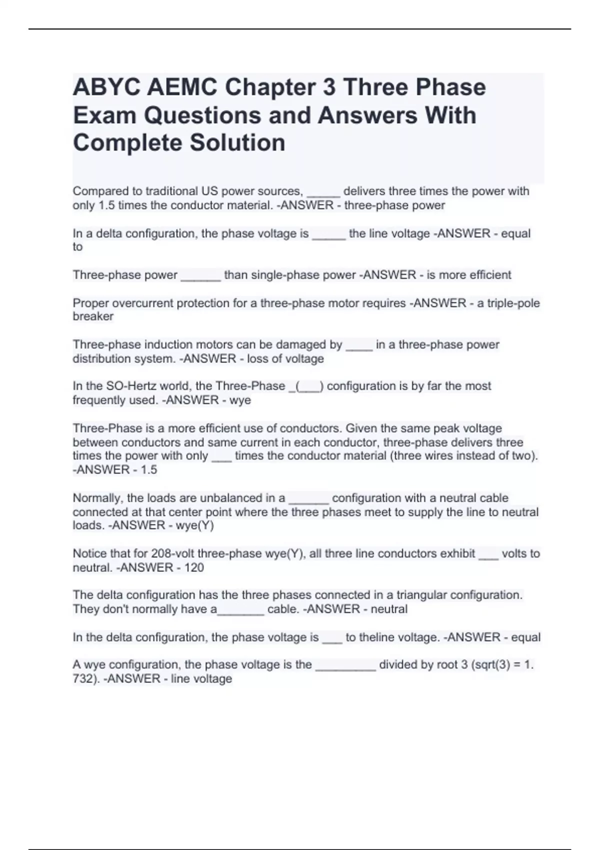 A wye configuration, the phase voltage is the _________ divided by root 3 (sqrt(3) = 1. 732). -ANSWER - line voltage A delta configuration does a great job at suppressing _____________, as well as maintaining balanced voltages when load currents are severely unbalanced while using only 3 wires -ANSWER - triplen harmonic magnetizing current