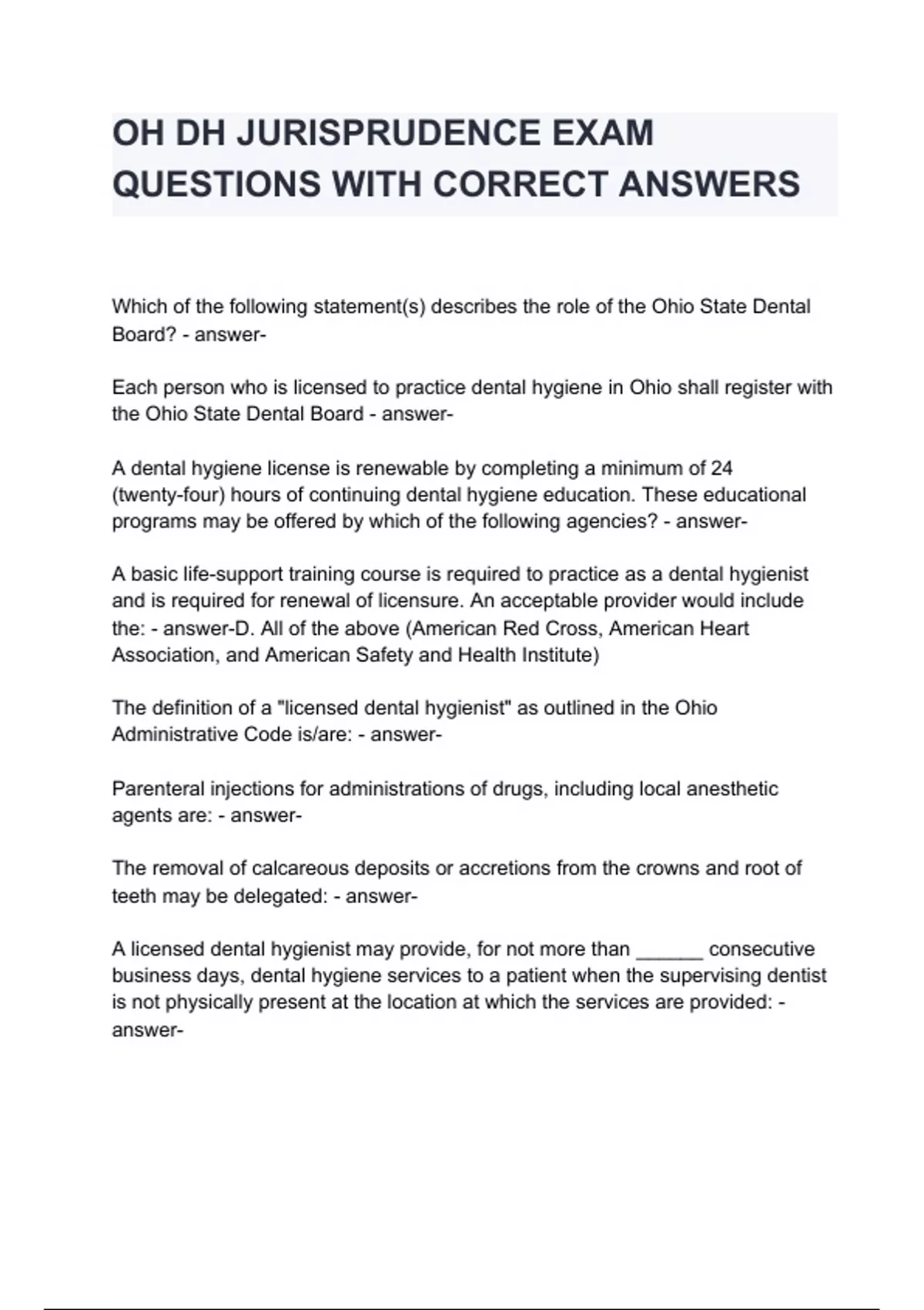 OH DH JURISPRUDENCE EXAM QUESTIONS WITH CORRECT ANSWERS Which of the following statement(s) describes the role of the Ohio State Dental Board? - answerEach person who is licensed to practice dental hygiene in Ohio shall register with the Ohio State Dental Board - answerA dental hygiene license is renewable by completing a minimum of 24 (twenty-four) hours of continuing dental hygiene education. These educational programs may be offered by which of the following agencies? - answerA basic life-support training course is required to practice as a dental hygienist and is required for renewal of licensure. An acceptable provider would include the: - answer-D. All of the above (American Red Cross, American Heart Association, and American Safety and Health Institute) The definition of a "licensed dental hygienist" as outlined in the Ohio Administrative Code is/are: - answerParenteral injections for administrations of drugs, including local anesthetic agents are: - answerThe removal of calcareous deposits or accretions from the crowns and root of teeth may be de