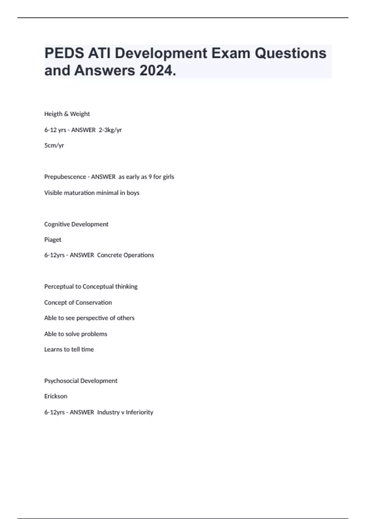 PEDS ATI Development Exam Questions and Answers 2024. Heigth & Weight 6-12 yrs 2-3kg/yr 5cm/yr Prepubescence as early as 9 for girls Visible maturation minimal in boys Cognitive Development Piaget 6-12yrs Concrete Operations Perceptual to Conceptual thinking Concept of Conservation Able to see perspective of others Able to solve problems Learns to tell time Psychosocial Development Erickson 6-12yrs Industry v Inferiority A sense of accomplishment from gained through competition and cooperation Sense of industry derives from skills & knowledge to prepare as contributing members of society Should be challenged with tasks and individual differences to work through the tasks