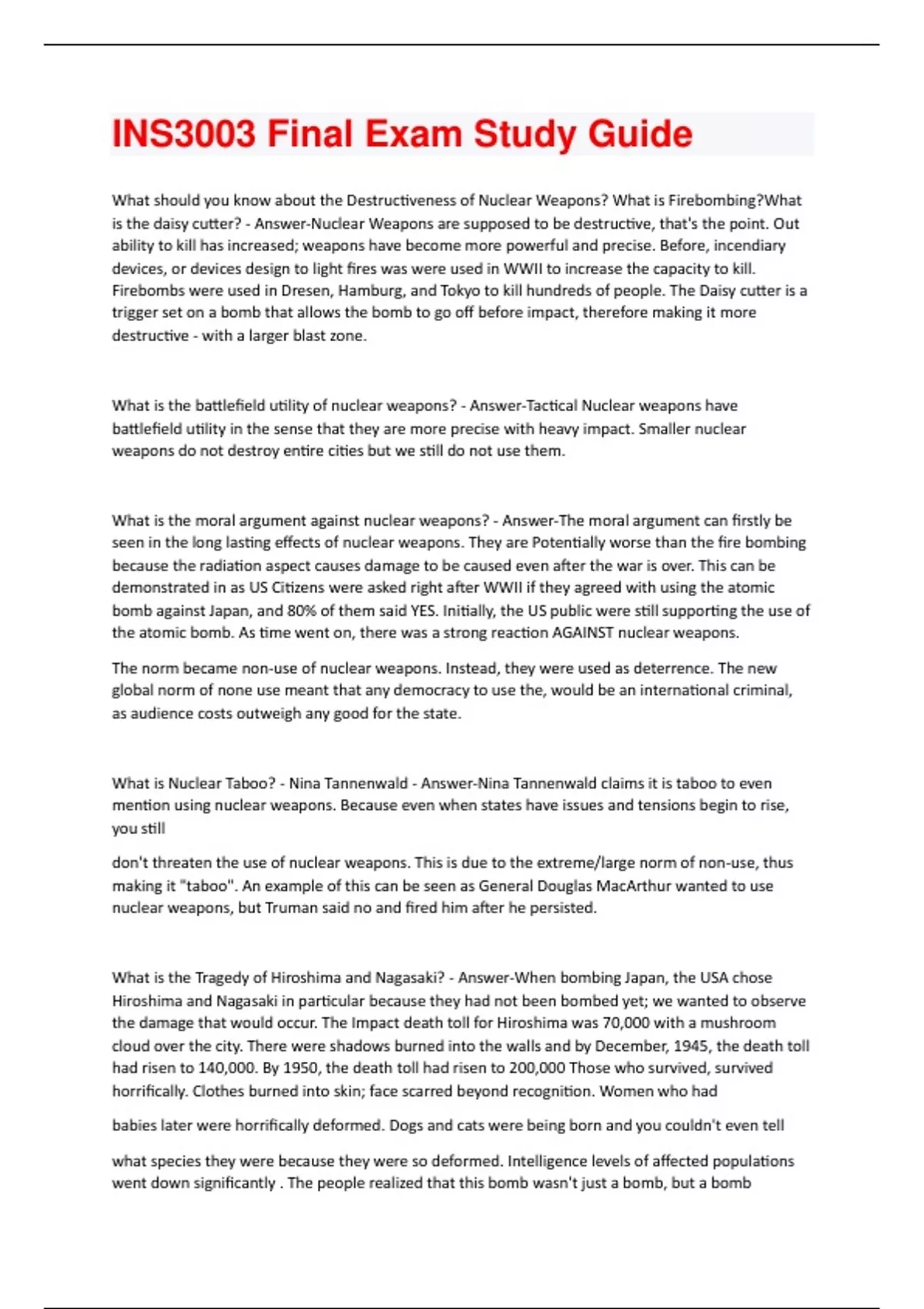 What should you know about the Destructiveness of Nuclear Weapons? What is Firebombing?What is the daisy cutter? - Answer-Nuclear Weapons are supposed to be destructive, that's the point. Out ability to kill has increased; weapons have become more powerful and precise. Before, incendiary devices, or devices design to light fires was were used in WWII to increase the capacity to kill. Firebombs were used in Dresen, Hamburg, and Tokyo to kill hundreds of people. The Daisy cutter is a trigger set on a bomb that allows the bomb to go off before impact, therefore making it more destructive - with a larger blast zone. What is the battlefield utility of nuclear weapons? - Answer-Tactical Nuclear weapons have battlefield utility in the sense that they are more precise with heavy impact. Smaller nuclear weapons do not destroy entire cities but we still do not use them. What is the moral argument against nuclear weapons? - Answer-The moral argument can firstly be seen in the long lasting effects of nuclear weapons. They are Potentially worse than the fire bombing because the radiation aspect causes damage to be caused even after the war is over. This can be demonstrated in as US Citizens were asked right after WWII if they agreed with using the atomic bomb against Japan, and 80% of them said YES. Initially, the US public were still supporting the use of the atomic bomb. As time went on, there was a strong reaction AGAINST nuclear weapons. The norm became non-use of nuclear weapons. Instead, they were used as deterrence. The new global norm of none use meant that any democracy to use the, would be an international criminal, as audience costs outweigh any good for the state. What is Nuclear Taboo? - Nina Tannenwald - Answer-Nina Tannenwald claims it is taboo to even mention using nuclear weapons. Because even when states have issues and tensions begin to rise, you still don't threaten the use of nuclear weapons. This is due to the extreme/large norm of non-use, thus making it "taboo". An example of this can be seen as General Douglas MacArthur wanted to use nuclear weapons, but Truman said no and fired him after he persisted. What is the Tragedy of Hiroshima and Nagasaki? - Answer-When bombing Japan, the USA chose Hiroshima and Nagasaki in particular because they had not been bombed yet; we wanted to observe the damage that would occur. The Impact death toll for Hiroshima was 70,000 with a mushroom cloud over the city. There were shadows burned into the walls and by December, 1945, the death toll had risen to 140,000. By 1950, the death toll had risen to 200,000 Those who survived, survived horrifically. Clothes burned into skin; face scarred beyond recognition. Women who had babies later were horrifically deformed. Dogs and cats were being born and you couldn't even tell what species they were because they were so deformed. Intelligence levels of affected populations went down significantly . The people realized that this bomb wasn't just a bomb, but a bombof radiation. This is a large reason why the non-use norm developed in 1950. Biological (1972) and Chemical Weapons (1993) Treaties - Answer-Biological and Chemical weapons are also considered to have an immoral element to them. They kill non-selectively and are not conventional weapons. The Biological Weapons treaty banned biological weapons in 1972 and The Chemical Weapons Convention banned chemical weapons in 1993. The countries who commit to these treaties were committing to destroy their biological and chemical weapons. This is a slow process, because it is hard to destroy these weapons in a safe way. Disarmament or Deterrence - Answer-There are 2 very different approaches to handling nuclear weapons. People ask, Should we get rid of nuclear weapons, and disarm? Or should we use them for purposes of deterrence? Nevertheless, Nuclear powers refused to even consider disarming, so it came down to not using these weapons and using them for deterrence. In the beginning of the Cold War, it was the goal to get as many nuclear weapons as we could, as quickly as we could until the 1960s where there was an extreme build up of nuclear weapons. We then started considering protective strategies because both sides had massive amounts of nuclear weapons and deterrence became the method of use later on. Arms Control History - Overview - Answer-There was a shift in thinking from "frantic buildup" to "arms control" in 1960s. This was never about disarmament—this was about, at some point, limiting the buildup and matching capabilities with the enemy. Consequently, "Balance of Capabilities" was the goal for nations in conflict because equally balanced powers can off-set each other. A balance of capabilities when considering going to war, means that it is too risky to go to war, so the conflict will not occur. Part of this idea was achieving mutual vulnerability. MAD to MAP - Answer-Mutual vulnerability factored into Mutually Assured Destruction (MAD). A maintained vulnerability means reducing defensive capabilities. Both the USA and Soviet Union did this because they both had second strike capabilities and a nuclear triad. So, If we could attack them but know they could hit us back, how likely would we be to initiate the first strike? Not at all. The nuclear war is the "suicidal" war; nobody is going to win, nobody is going to survive. It is assured that if the war starts, both countries are destroyed. The strategy of MAD provided deterrence so that neither side waswilling to initiate the war. After a long series of nuclear treaties after MAD there were more talks and tensions were eased. The focus was now on reducing arms which paved way for Mutually Assured Protection (MAP)/ MAP reduced the number of nuclear weapons, but increased our defensive capabilities.Arms Treaties and Dates - Answer-1963 - Partial Test Ban Treaty - limits testing nuclear weapons in order to preserve the environment 1968 - NPT 1968 - SALT I -Strategic Arms Limitation Talk; limiting th