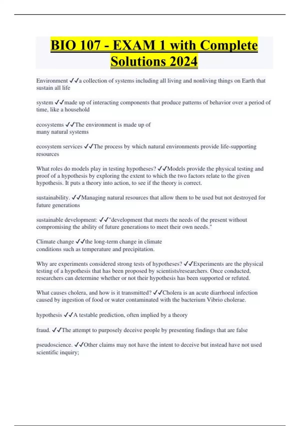 BIO 107 - EXAM 1 with Complete Solutions 2024 Environment a collection of systems including all living and nonliving things on Earth that sustain all life system made up of interacting components that produce patterns of behavior over a period of time, like a household ecosystems The environment is made up of many natural systems ecosystem services The process by which natural environments provide life-supporting resources What roles do models play in testing hypotheses? Models provide the physical testing and proof of a hypothesis by exploring the extent to which the two factors relate to the given hypothesis. It puts a theory into action, to see if the theory is correct. sustainability. Managing natural resources that allow them to be used but not destroyed for future generations sustainable development: "development that meets the needs of the present without compromising the ability of future generations to meet their own needs." Climate change the long-term change in climate conditions such as temperature and precipitation. Why are experiments considered strong tests of hypotheses? Experiments are the physical testing of a hypothesis that has been proposed by scientists/researchers. Once conducted, researchers can determine whether or not their hypothesis has been supported or refuted. What causes cholera, and how is it transmitted? Cholera is an acute diarrhoeal infection caused by ingestion of food or water contaminated with the bacterium Vibrio cholerae. hypothesis A testable prediction, often implied by a theory fraud. The attempt to purposely deceive people by presenting findings that are false pseudoscience. Other claims may not have the intent to deceive but instead have not used scientific inquiry;