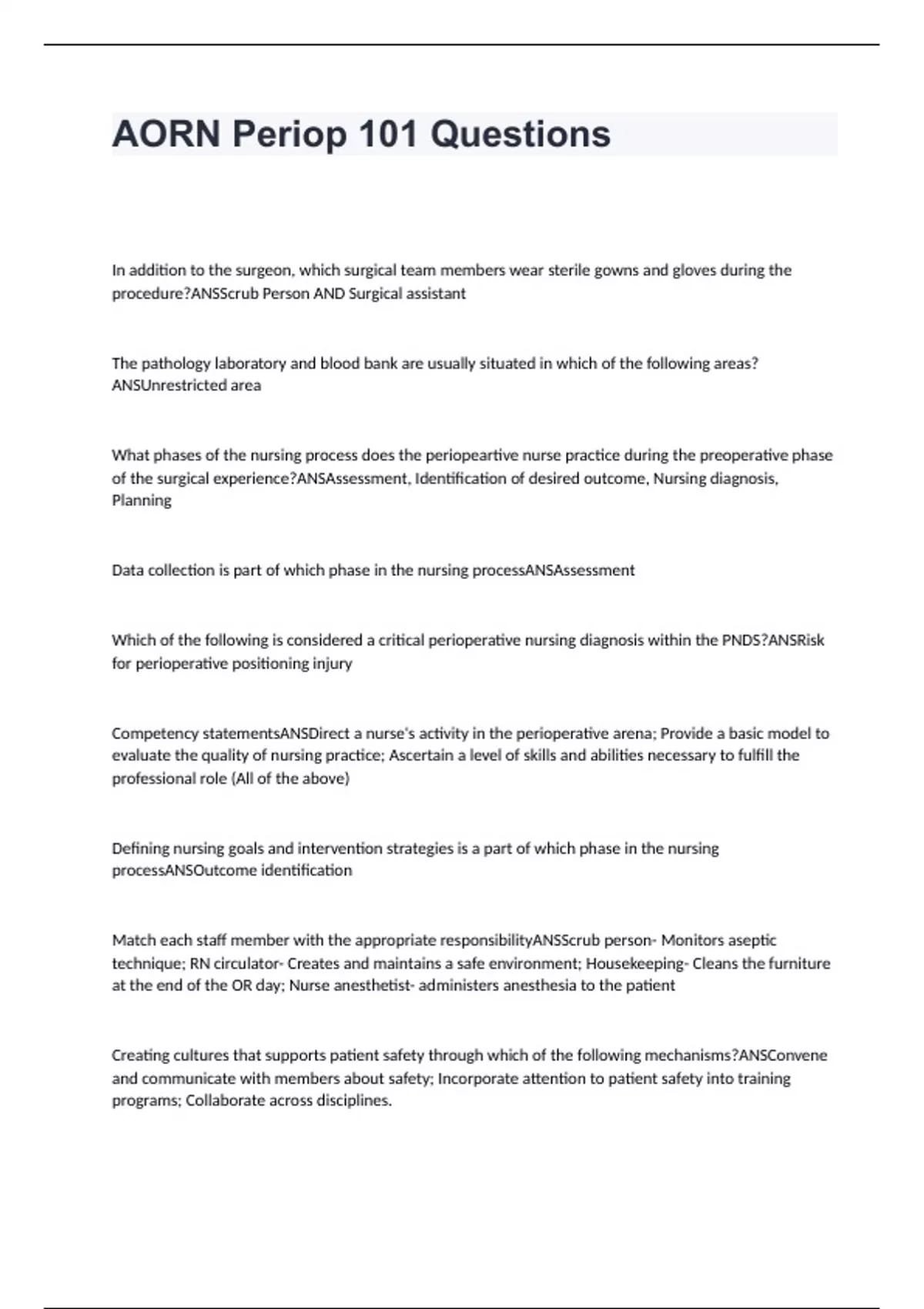 AORN Periop 101 Questions and Answers 2024 Lastest Edition