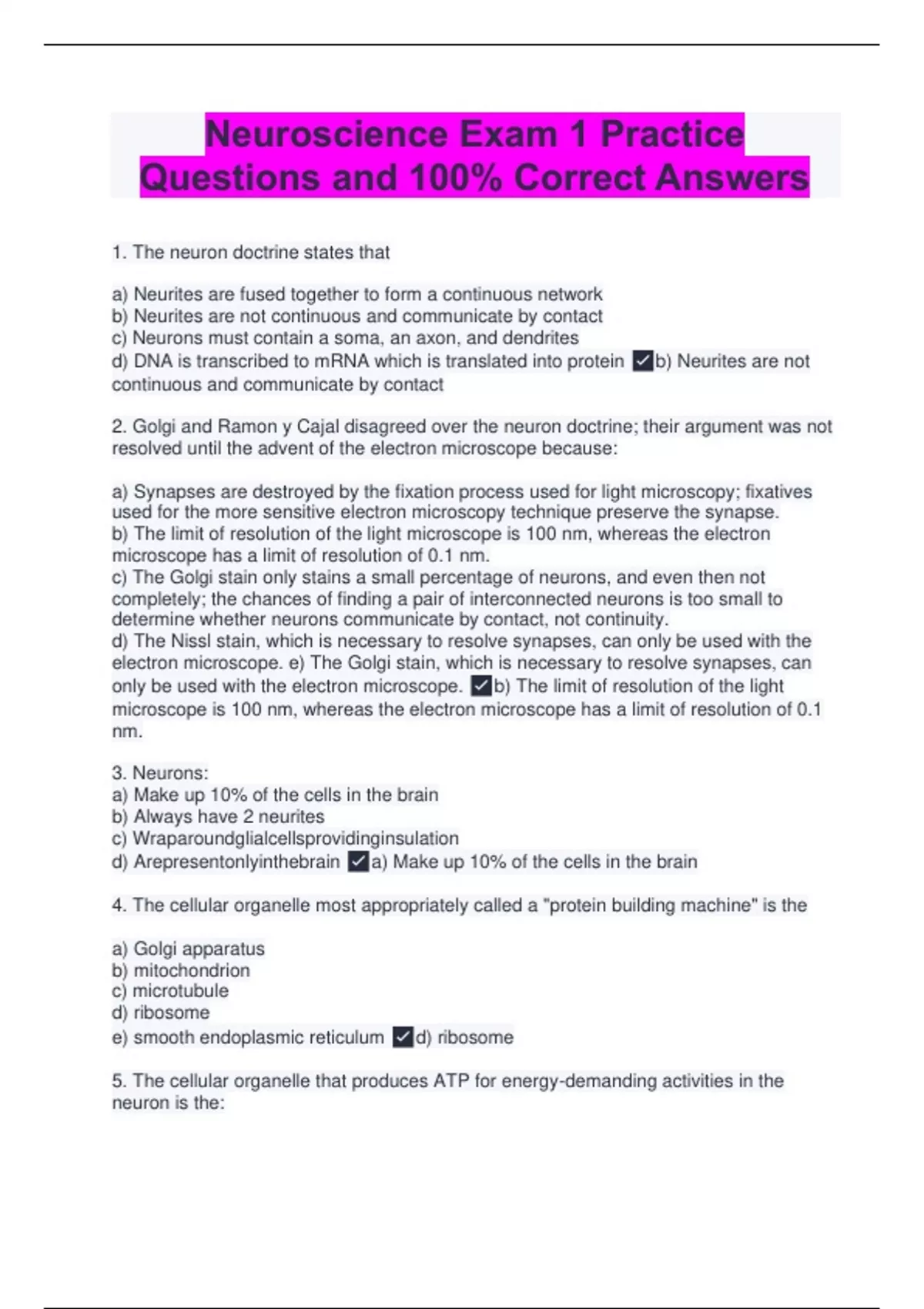 1. The neuron doctrine states that a) Neurites are fused together to form a continuous network b) Neurites are not continuous and communicate by contact c) Neurons must contain a soma, an axon, and dendrites d) DNA is transcribed to mRNA which is translated into protein b) Neurites are not continuous and communicate by contact 2. Golgi and Ramon y Cajal disagreed over the neuron doctrine; their argument was not resolved until the advent of the electron microscope because: a) Synapses are destroyed by the fixation process used for light microscopy; fixatives used for the more sensitive electron microscopy technique preserve the synapse. b) The limit of resolution of the light microscope is 100 nm, whereas the electron microscope has a limit of resolution of 0.1 nm. c) The Golgi stain only stains a small percentage of neurons, and even then not completely; the chances of finding a pair of interconnected neurons is too small to determine whether neurons communicate by contact, not continuity. d) The Nissl stain, which is necessary to resolve synapses, can only be used with the electron microscope. e) The Golgi stain, which is necessary to resolve synapses, can only be used with the electron microscope. b) The limit of resolution of the light microscope is 100 nm, whereas the electron microscope has a limit of resolution of 0.1 nm. 3. Neurons: a) Make up 10% of the cells in the brain b) Always have 2 neurites c) Wraparoundglialcellsprovidinginsulation d) Arepresentonlyinthebrain a) Make up 10% of the cells in the brain 4. The cellular organelle most appropriately called a "protein building machine" is the a) Golgi apparatus b) mitochondrion c) microtubule d) ribosome e) smooth endoplasmic reticulum d) ribosome 5. The cellular organelle that produces ATP for energy-demanding activities in the neuron is the: a) Golgi apparatus b) mitochondrion c) microtubule d) ribosome e) smooth endoplasmic reticulum c) microtubule 6. Which of the following is TRUE about ribosomes? a) They are necessary for transcription b) They are found dotting the surface of smooth ER c) They are not found in glia d) They bind mRNA d) They bind mRNA