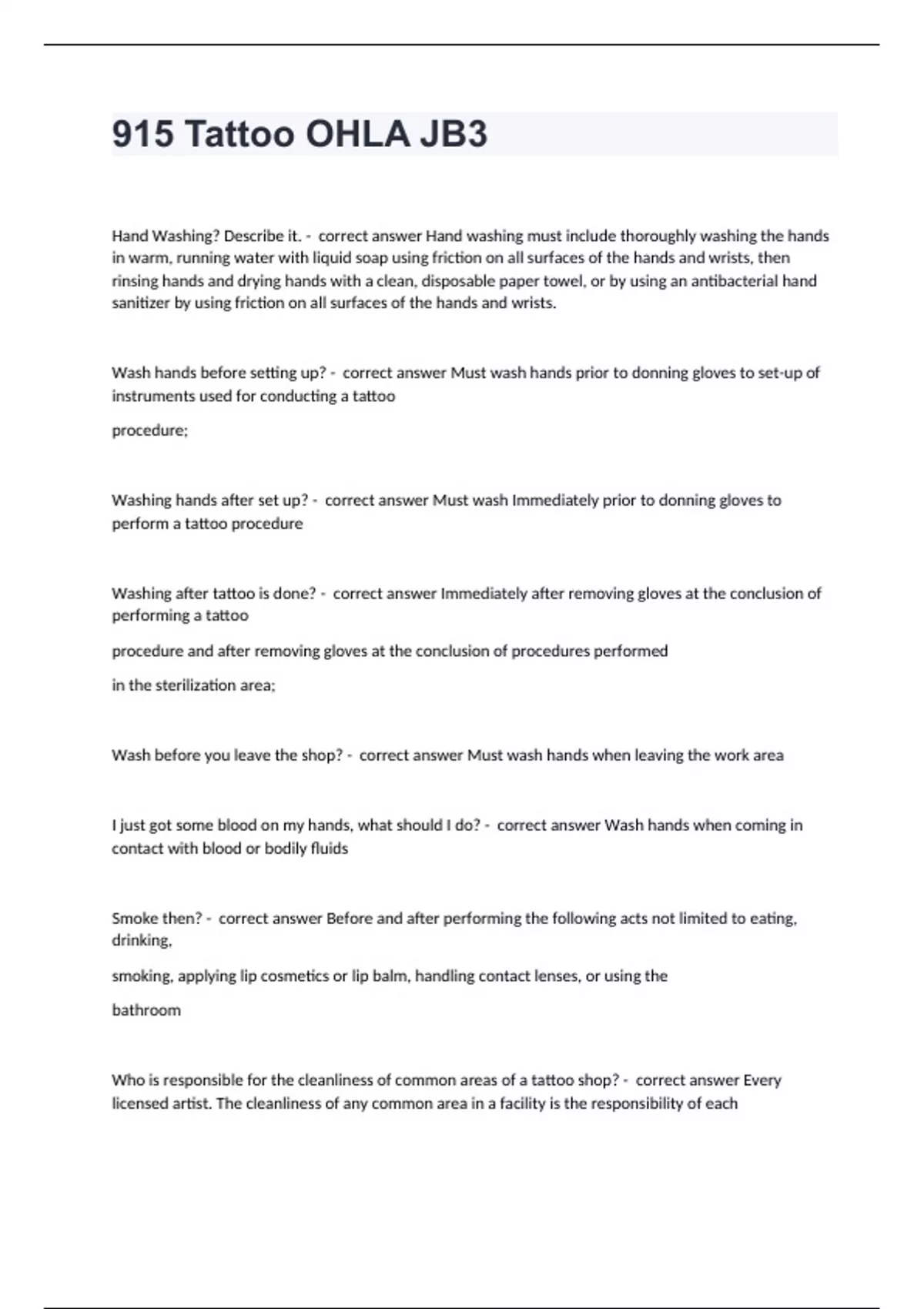 915 Tattoo OHLA JB3Hand Washing? Describe it. - correct answer Hand washing must include thoroughly washing the hands in warm, running water with liquid soap using friction on all surfaces of the hands and wrists, then rinsing hands and drying hands with a clean, disposable paper towel, or by using an antibacterial hand sanitizer by using friction on all surfaces of the hands and wrists. Wash hands before setting up? - correct answer Must wash hands prior to donning gloves to set-up of instruments used for conducting a tattoo procedure; Washing hands after set up? - correct answer Must wash Immediately prior to donning gloves to perform a tattoo procedure Washing after tattoo is done? - correct answer Immediately after removing gloves at the conclusion of performing a tattoo procedure and after removing gloves at the conclusion of procedures performed in the sterilization area; Wash before you leave the shop? - correct answer Must wash hands when leaving the work area I just got some blood on my hands, what should I do? - correct answer Wash hands when coming in contact with blood or bodily fluids Smoke then? - correct answer Before and after performing the following acts not limited to eating, drinking, smoking, applying lip cosmetics or lip balm, handling contact lenses, or using the bathroom Who is responsible for the cleanliness of common areas of a tattoo shop? - correct answer Every licensed artist. The cleanliness of any common area in a facility is the responsibility of each