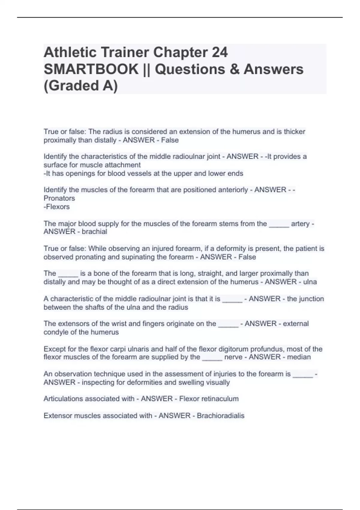 Athletic Trainer Chapter 24 SMARTBOOK || Questions & Answers (Graded A) True or false: The radius is considered an extension of the humerus and is thicker proximally than distally - ANSWER - False Identify the characteristics of the middle radioulnar joint - ANSWER - -It provides a surface for muscle attachment -It has openings for blood vessels at the upper and lower ends Identify the muscles of the forearm that are positioned anteriorly - ANSWER - -Pronators -Flexors The major blood supply for the muscles of the forearm stems from the _____ artery - ANSWER - brachial True or false: While observing an injured forearm, if a deformity is present, the patient is observed pronating and supinating the forearm - ANSWER - False The _____ is a bone of the forearm that is long, straight, and larger proximally than distally and may be thought of as a direct extension of the humerus - ANSWER - ulna A characteristic of the middle radioulnar joint is that it is _____ - ANSWER - the junction between the shafts of the ulna and the radius The extensors of the wrist and fingers originate on the _____ - ANSWER - external condyle of the humerus Except for the flexor carpi ulnaris and half of the flexor digitorum profundus, most of the flexor muscles of the forearm are supplied by the _____ nerve - ANSWER - median An observation technique used in the assessment of injuries to the forearm is _____ - ANSWER - inspecting for deformities and swelling visually Articulations associated with - ANSWER - Flexor retinaculum Extensor muscles associated with - ANSWER - Brachioradialis