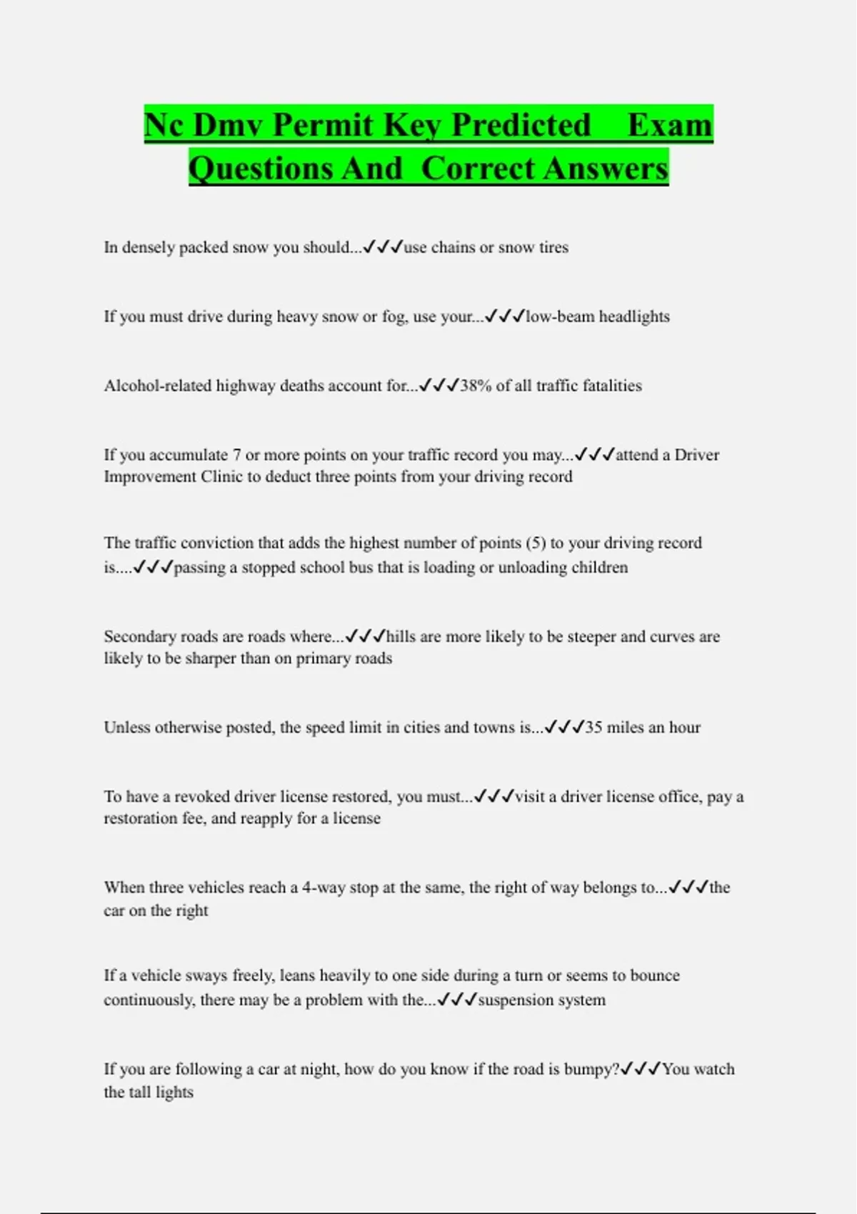 Nc Dmv Permit Key Predicted Exam Questions And Correct Answers