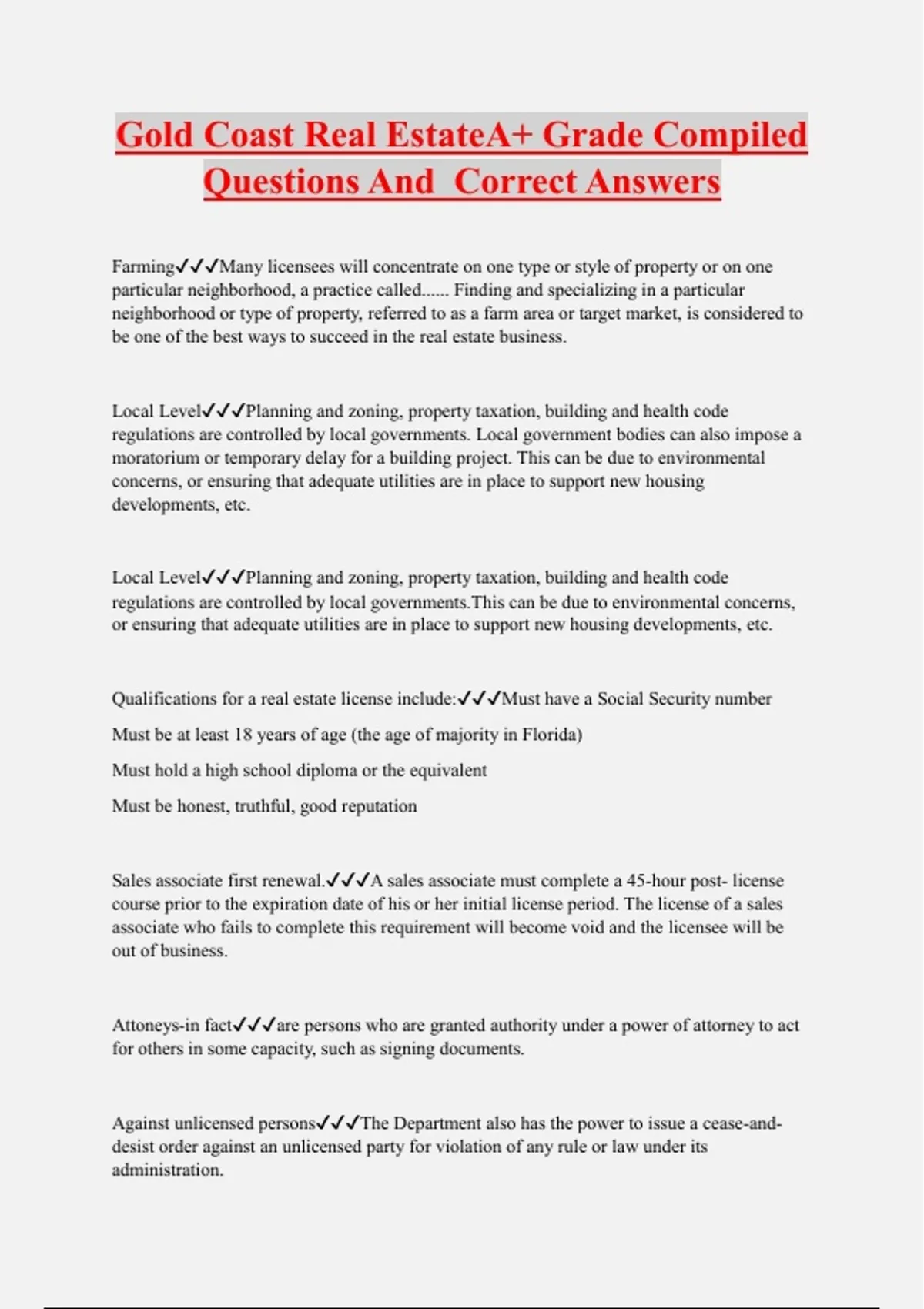Gold Coast Real EstateA+ Grade Compiled Questions And Correct Answers