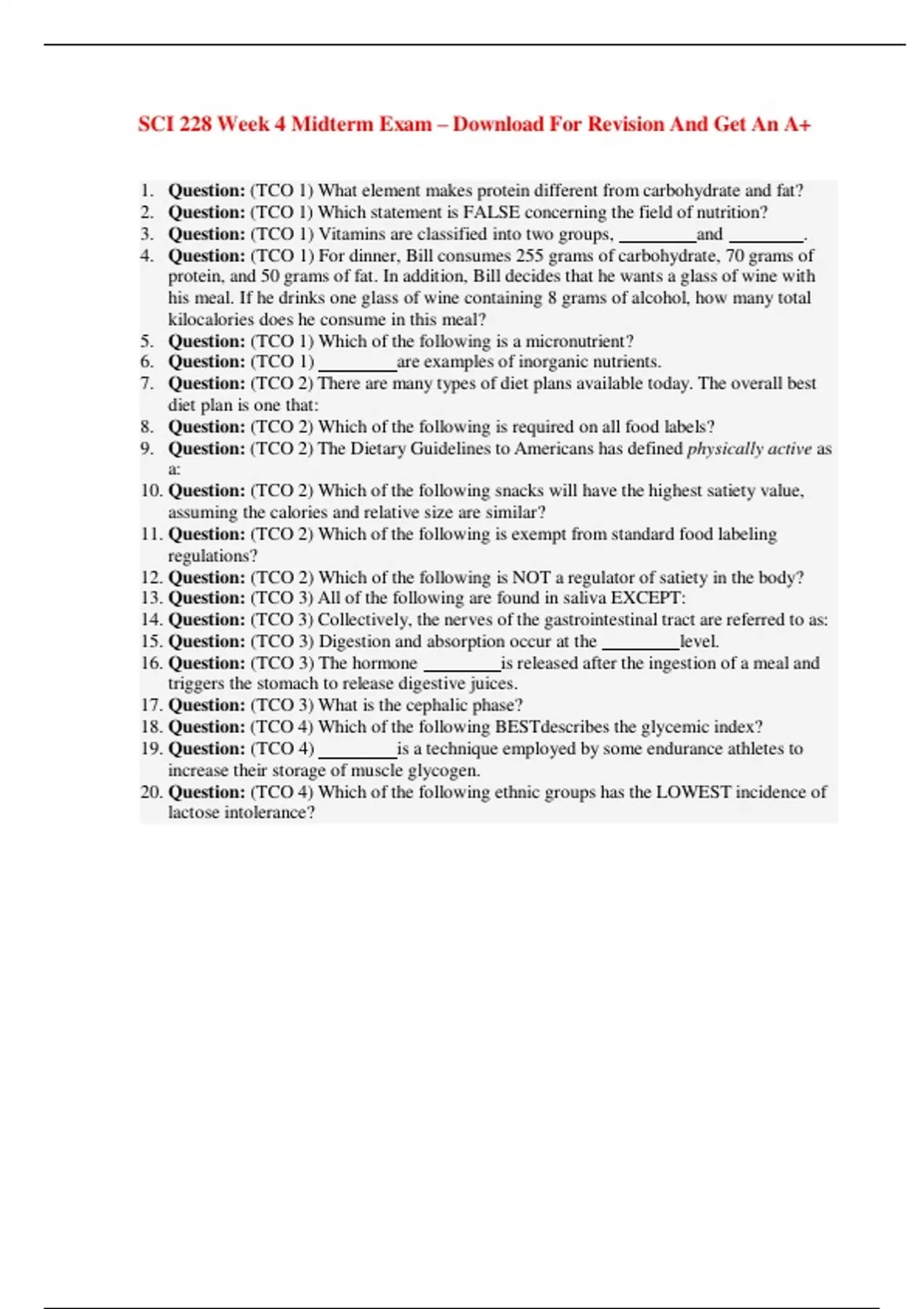 SCI 228 Week 4 Midterm Exam – Download For Revision And Get An A+ 1. Question: (TCO 1) What element makes protein different from carbohydrate and fat? 2. Question: (TCO 1) Which statement is FAL SE concerning the field of nutrition? 3. Question: (TCO 1) Vitamins are classified into two groups, and . 4. Question: (TCO 1) For dinner, Bill consumes 255 grams of carbohydrate, 70 grams of protein, and 50 grams of fat. In addition, Bill decides that he wants a glass of wine with his meal. If he drinks one glass of wine containing 8 grams of alcohol, how many total kilocalories does he consume in this meal? 5. Question: (TCO 1) Which of the following is a micronutrient? 6. Question: (TCO 1) are examples of inorganic nutrients. 7. Question: (TCO 2) There are many types of diet plans available today. The overall best diet plan is one that: 8. Question: (TCO 2) Which of the following is required on all food labels? 9. Question: (TCO 2) The Dietary Guidelines to Americans has defined physically active as a: 10. Question: (TCO 2) Which of the following snacks will have the highest satiety value, assuming the calories and relative size are similar? 11. Question: (TCO 2) Which of the following is exempt from standard food labeling regulations? 12. Question: (TCO 2) Which of the following is NOT a regulator of satiety in the body? 13. Question: (TCO 3) All of the following are found in saliva EXCEPT: 14. Question: (TCO 3) Collectively, the nerves of the gastrointestinal tract are referred to as: 15. Question: (TCO 3) Digestion and absorption occur at the level. 16. Question: (TCO 3) The hormone is released after the ingestion of a meal and triggers the stomach to release digestive juices. 17. Question: (TCO 3) What is the cephalic phase? 18. Question: (TCO 4) Which of the following BESTdescribes the glycemic index? 19. Question: (TCO 4) is a technique employed by some endurance athletes to increase their storage of muscle glycogen. 20. Question: (TCO 4) Which of the following ethnic groups has the LOWEST incidence of lactose intolerance?