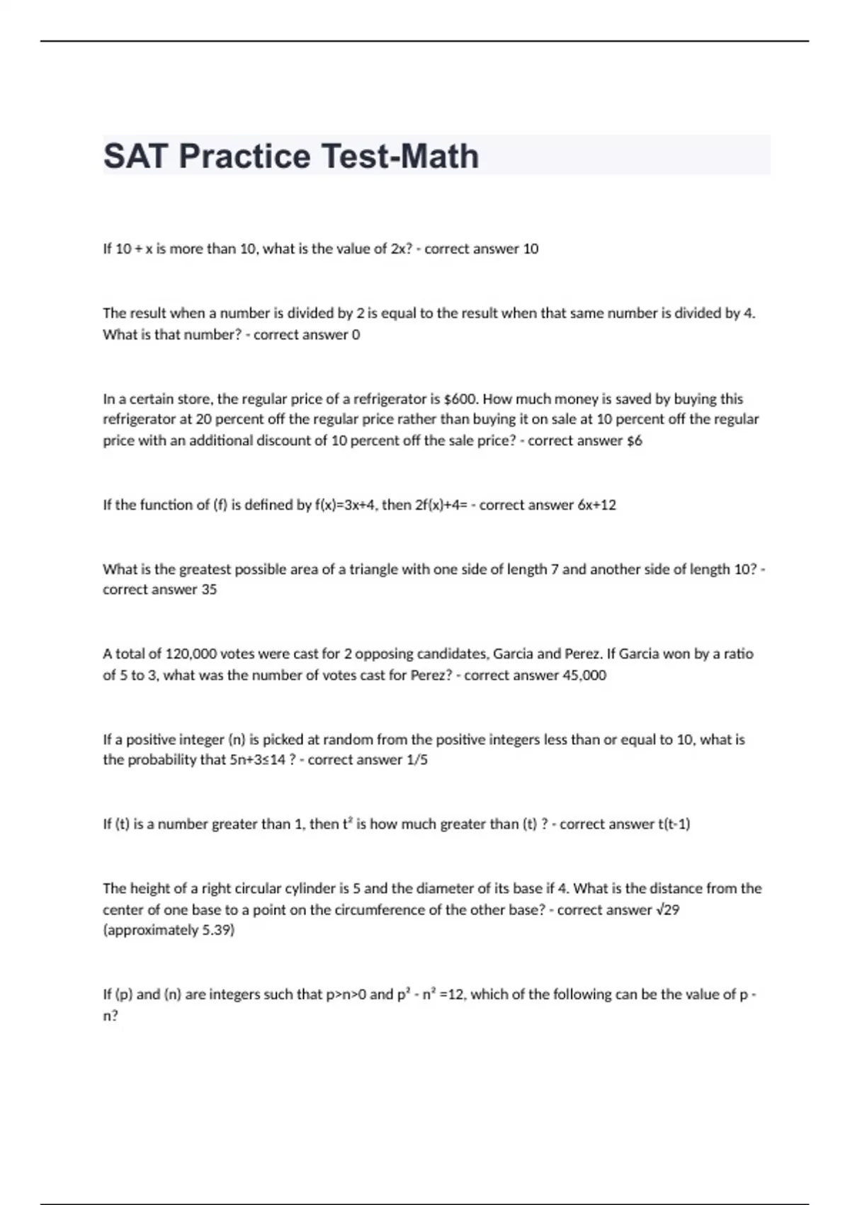 If 10 + x is more than 10, what is the value of 2x? - correct answer 10 The result when a number is divided by 2 is equal to the result when that same number is divided by 4. What is that number? - correct answer 0 In a certain store, the regular price of a refrigerator is $600. How much money is saved by buying this refrigerator at 20 percent off the regular price rather than buying it on sale at 10 percent off the regular price with an additional discount of 10 percent off the sale price? - correct answer $6 If the function of (f) is defined by f(x)=3x+4, then 2f(x)+4= - correct answer 6x+12 What is the greatest possible area of a triangle with one side of length 7 and another side of length 10? - correct answer 35 A total of 120,000 votes were cast for 2 opposing candidates, Garcia and Perez. If Garcia won by a ratio of 5 to 3, what was the number of votes cast for Perez? - correct answer 45,000 If a positive integer (n) is picked at random from the positive integers less than or equal to 10, what is the probability that 5n+3≤14 ? - correct answer 1/5 If (t) is a number greater than 1, then t² is how much greater than (t) ? - correct answer t(t-1) The height of a right circular cylinder is 5 and the diameter of its base if 4. What is the distance from the center of one base to a point on the circumference of the other base? - correct answer √29 (approximately 5.39) If (p) and (n) are integers such that p>n>0 and p² - n² =12, which of the following can be the value of p - n?