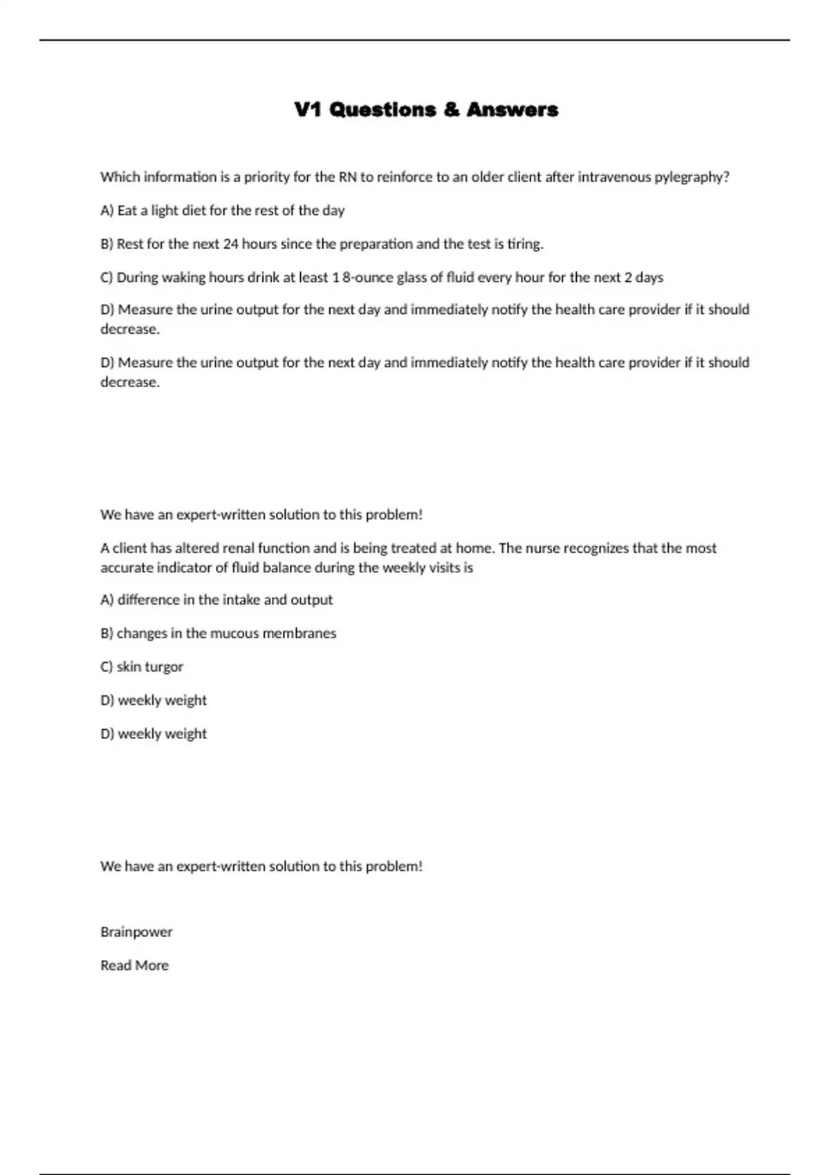 Which information is a priority for the RN to reinforce to an older client after intravenous pylegraphy? A) Eat a light diet for the rest of the day B) Rest for the next 24 hours since the preparation and the test is tiring. C) During waking hours drink at least 1 8-ounce glass of fluid every hour for the next 2 days D) Measure the urine output for the next day and immediately notify the health care provider if it should decrease. D) Measure the urine output for the next day and immediately notify the health care provider if it should decrease. We have an expert-written solution to this problem! A client has altered renal function and is being treated at home. The nurse recognizes that the most accurate indicator of fluid balance during the weekly visits is A) difference in the intake and output B) changes in the mucous membranes C) skin turgor D) weekly weight D) weekly weight
