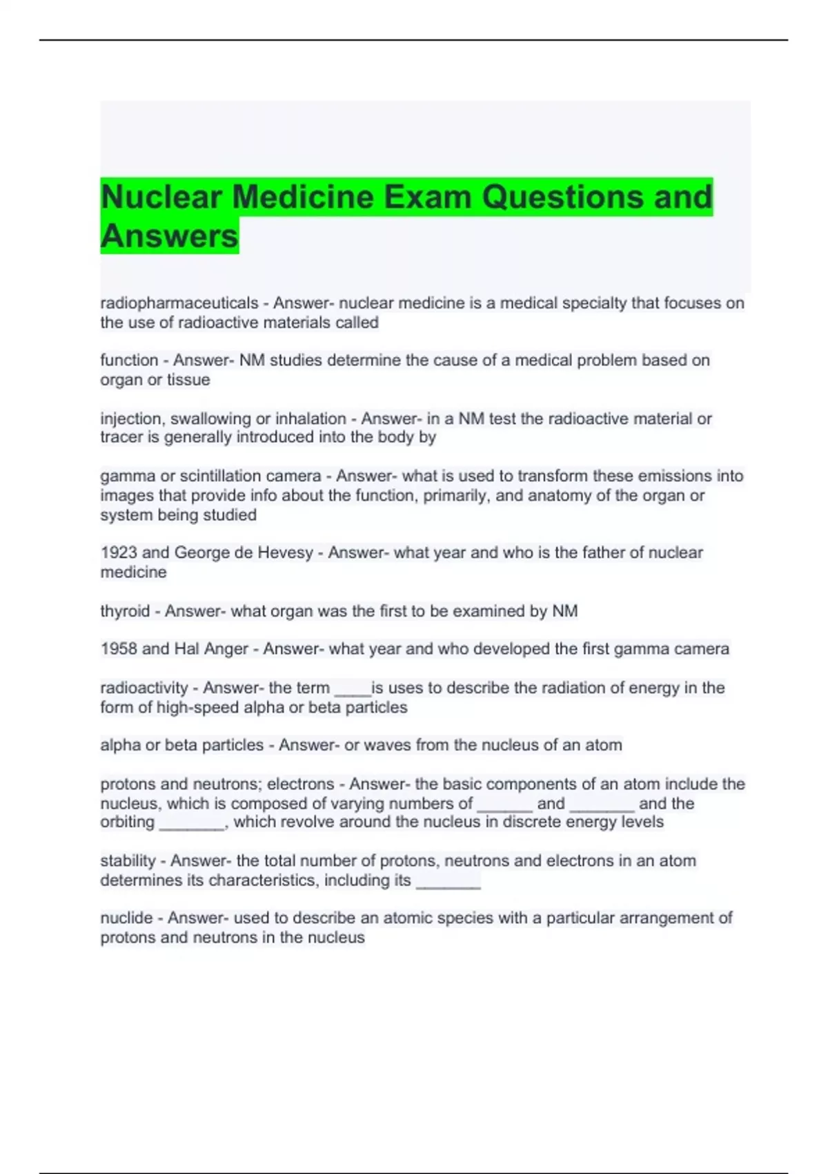 Nuclear Medicine Exam Questions and Answers 2024