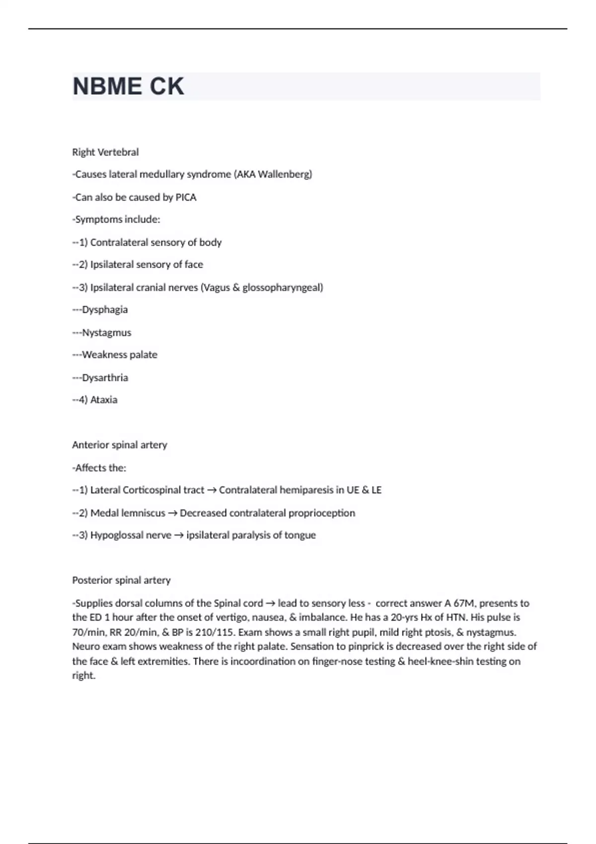 NBME CK Right Vertebral -Causes lateral medullary syndrome (AKA Wallenberg) -Can also be caused by PICA -Symptoms include: --1) Contralateral sensory of body --2) Ipsilateral sensory of face --3) Ipsilateral cranial nerves (Vagus & glossopharyngeal) ---Dysphagia ---Nystagmus ---Weakness palate ---Dysarthria --4) Ataxia Anterior spinal artery -Affects the: --1) Lateral Corticospinal tract → Contralateral hemiparesis in UE & LE --2) Medal lemniscus → Decreased contralateral proprioception --3) Hypoglossal nerve → ipsilateral paralysis of tongue Posterior spinal artery -Supplies dorsal columns of the Spinal cord → lead to sensory less - correct answer A 67M, presents to the ED 1 hour after the onset of vertigo, nausea, & imbalance. He has a 20-yrs Hx of HTN. His pulse is 70/min, RR 20/min, & BP is 210/115. Exam shows a small right pupil, mild right ptosis, & nystagmus. Neuro exam shows weakness of the right palate. Sensation to pinprick is decreased over the right side of the face & left extremities. There is incoordination on finger-nose testing & heel-knee-shin testing on right. Which of the following arteries is most likely to be occluded? (Right Vertebral OR Anterior spinal) Decreased androgens -Testosterone is the most influential hormone for sexual desire in men & women -Pathophysio → Pt is taking conjugated estrogen → this increases the amount of SHB which then binds testosterone & DHT Decreased LH -LH would be increased d/t neg feedback from the decreased testosterone - correct answer A 52F, presents b/c decreased libido; this symptom began 8 months ago, after she underwent a TAO-BSO for leiomyomata uteri & menorrhagia. She has been taking hormone replacement therapy w/ conjugate estrogen since the operation. Exam shows a moist, rugated vagina. Which of the following is the most likely cause of these findings? (Decreased androgens OR Decreased LH) Insulin -Pt has insulin resistance (b/c of obesity & high blood sugar) → Insulin is elevated in this pt Ketones -Uncommon in DM II (Only seen in pts w/ DM I & only when they are in emergency situations →aka DKA) - correct answer A previously healthy 52M, presents b/c a 3-months Hx of increased urinary volume & increased urinary frequency at night. He has had a 15-lbs wt loss during this period despite no change in appetite. His father has HTN, & his mother has HTN & DM II, He currently weighs 210-lbs & is 70-in tall. His BP is 160/85 in both arms. Exam shows no other abnormalities. His non-fasting serum glucose is 280.