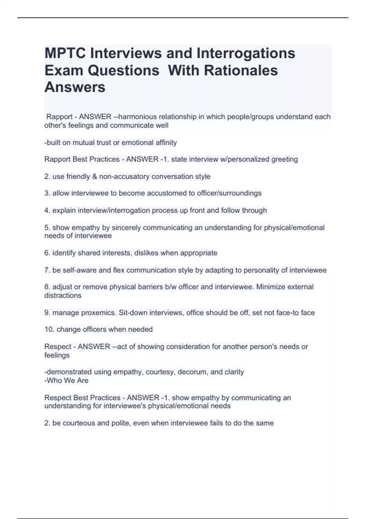 -built on mutual trust or emotional affinity Rapport Best Practices - ANSWER -1. state interview w/personalized greeting 2. use friendly & non-accusatory conversation style 3. allow interviewee to become accustomed to officer/surroundings 4. explain interview/interrogation process up front and follow through 5. show empathy by sincerely communicating an understanding for physical/emotional needs of interviewee 6. identify shared interests, dislikes when appropriate 7. be self-aware and flex communication style by adapting to personality of interviewee 8. adjust or remove physical barriers b/w officer and interviewee. Minimize external distractions 9. manage proxemics. Sit-down interviews, office should be off, set not face-to face 10. change officers when needed Respect - ANSWER --act of showing consideration for another person's needs or feelings -demonstrated using empathy, courtesy, decorum, and clarity -Who We Are Respect Best Practices - ANSWER -1. show empathy by communicating an understanding for interviewee's physical/emotional needs 2. be courteous and polite, even when interviewee fails to do the same