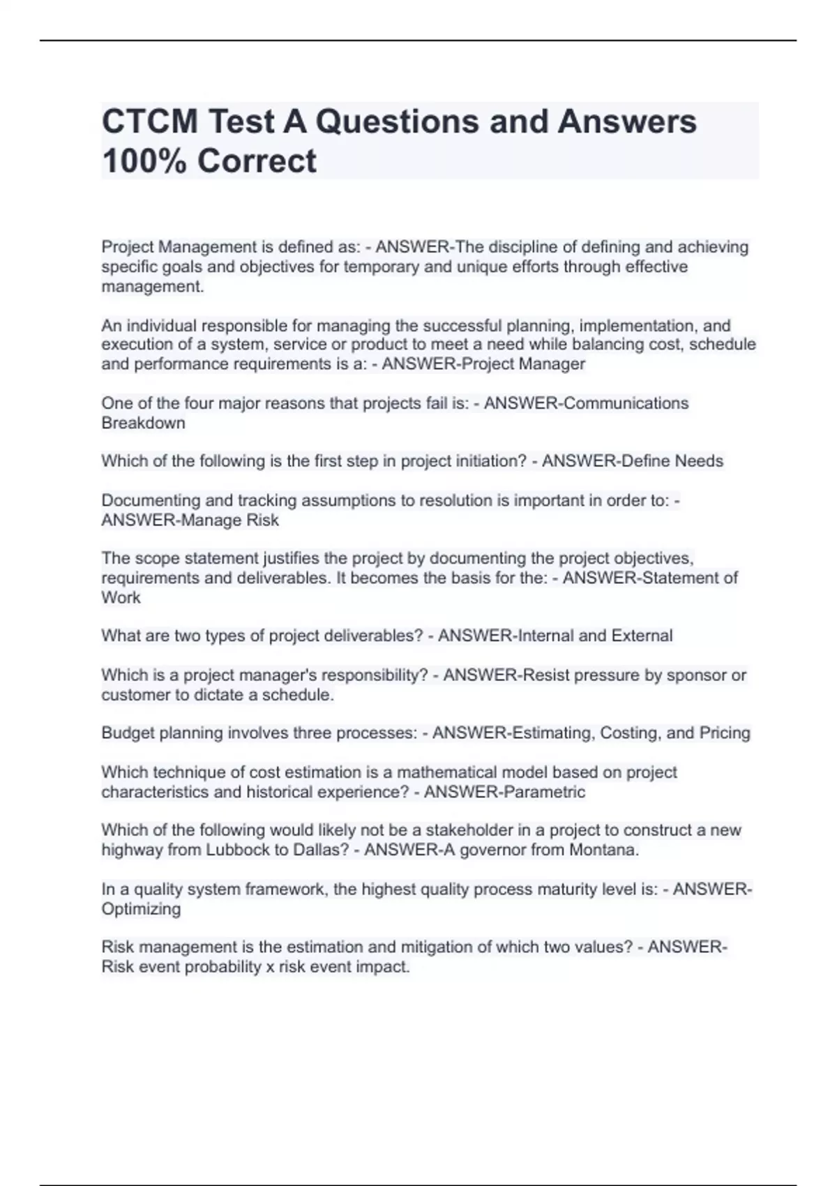 CTCM Test A Questions and Answers 100% Correct CTCM Test A Questions and Answers 100% Correct CTCM Test A Questions and Answers 100% Correct Project Management is defined as: - ANSWER-The discipline of defining and achieving specific goals and objectives for temporary and unique efforts through effective management. An individual responsible for managing the successful planning, implementation, and execution of a system, service or product to meet a need while balancing cost, schedule and performance requirements is a: - ANSWER-Project Manager One of the four major reasons that projects fail is: - ANSWER-Communications Breakdown Which of the following is the first step in project initiation? - ANSWER-Define Needs