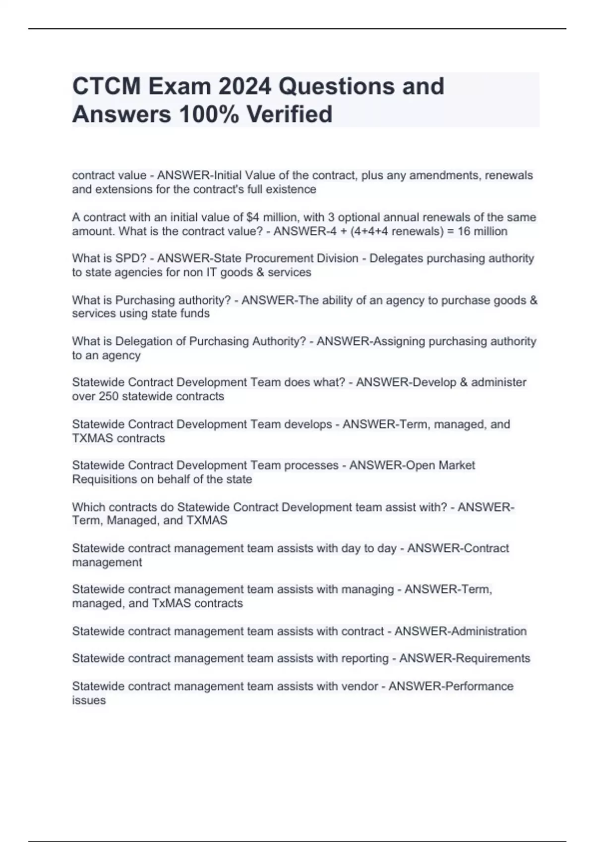 CTCM Exam 2024 Questions and Answers 100% VerifiedCTCM Exam 2024 Questions and Answers 100% VerifiedCTCM Exam 2024 Questions and Answers 100% Verified contract value - ANSWER-Initial Value of the contract, plus any amendments, renewals and extensions for the contract's full existence A contract with an initial value of $4 million, with 3 optional annual renewals of the same amount. What is the contract value? - ANSWER-4 + (4+4+4 renewals) = 16 million What is SPD? - ANSWER-State Procurement Division - Delegates purchasing authority to state agencies for non IT goods & services