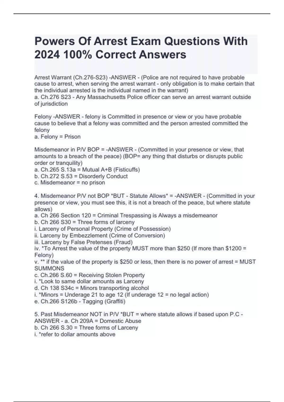 Felony -ANSWER - felony is Committed in presence or view or you have probable cause to believe that a felony was committed and the person arrested committed the felony a. Felony = Prison Misdemeanor in P/V BOP = -ANSWER - (Committed in your presence or view, that amounts to a breach of the peace) (BOP= any thing that disturbs or disrupts public order or tranquility) a. Ch.265 S.13a = Mutual A+B (Fisticuffs) b. Ch.272 S.53 = Disorderly Conduct c. Misdemeanor = no prison 4. Misdemeanor P/V not BOP *BUT - Statute Allows* = -ANSWER - (Committed in your presence or view, you must see this, it is not a breach of the peace, but where statute allows) a. Ch 266 Section 120 = Criminal Trespassing is Always a misdemeanor b. Ch 266 S30 = Three forms of larceny i. Larceny of Personal Property (Crime of Possession) ii. Larceny by Embezzlement (Crime of Conversion) iii. Larceny by False Pretenses (Fraud) iv. *To Arrest the value of the property MUST more than $250 (If more than $1200 = Felony) v. ** if the value of the property is $250 or less, then there is no power of arrest = MUST SUMMONS c. Ch.266 S.60 = Receiving Stolen Property i. *Look to same dollar amounts as Larceny d. Ch 138 S34c = Minors transporting alcohol i. *Minors = Underage 21 to age 12 (If underage 12 = no legal action) e. Ch.266 S126b - Tagging (Graffiti) 5. Past Misdemeanor NOT in P/V *BUT = where statute allows if based upon P.C -ANSWER - a. Ch 209A = Domestic Abuse b. Ch 266 S.30 = Three forms of Larceny i. *refer to dollar amounts above